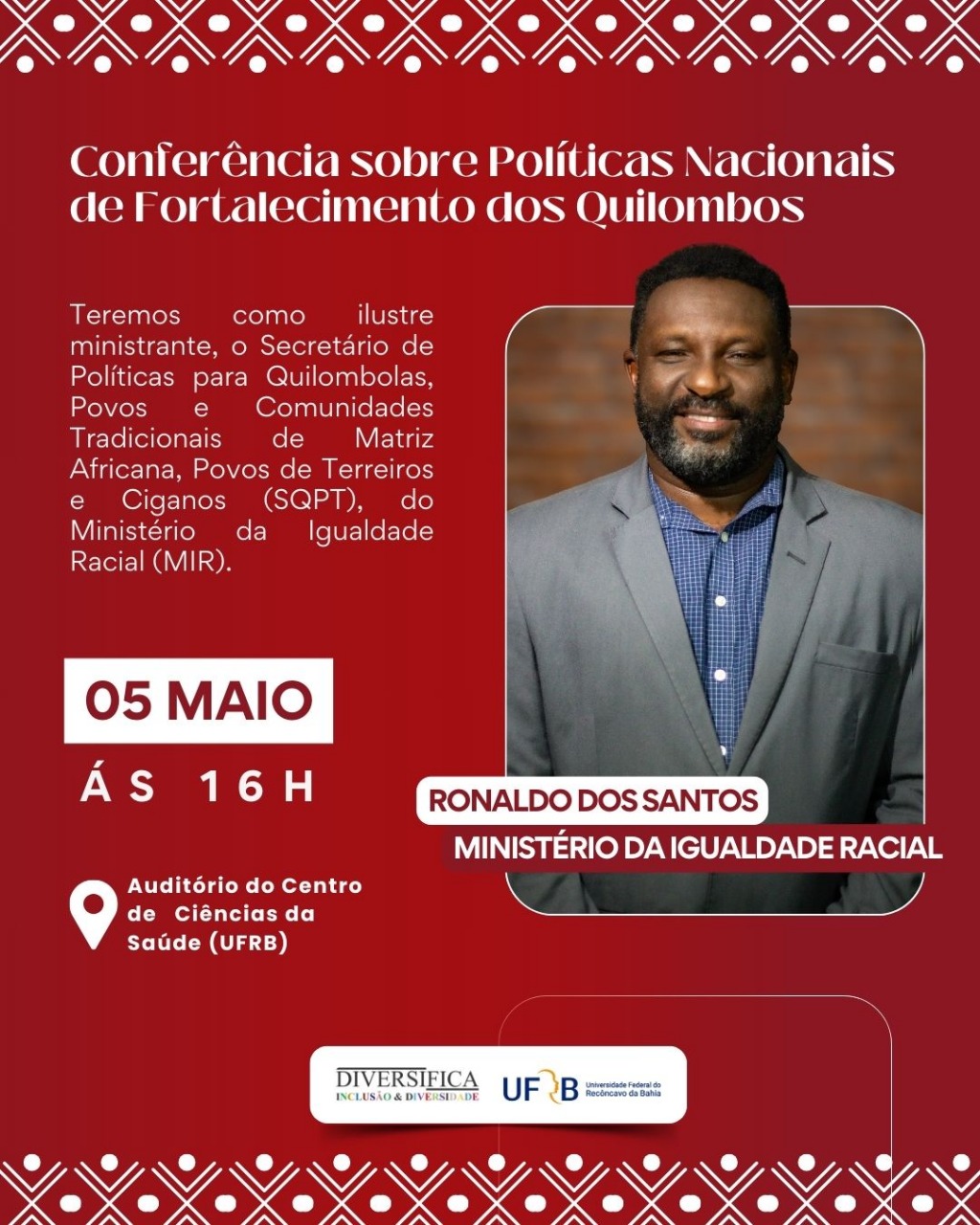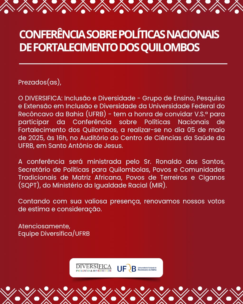 O DIVERSIFICA: Inclusão e Diversidade - Grupo de Ensino, Pesquisa e Extensão em Inclusão e Diversidade da Universidade Federal do Recôncavo da Bahia (UFRB) - tem a honra de convidar V.S.a para participar da Conferência sobre Políticas Nacionais de Fortalecimento dos Quilombos, a realizar-se no dia 05 de maio de 2025, às 16h, no Auditório do Centro de Ciências da Saúde da UFRB, em Santo Antônio de Jesus.