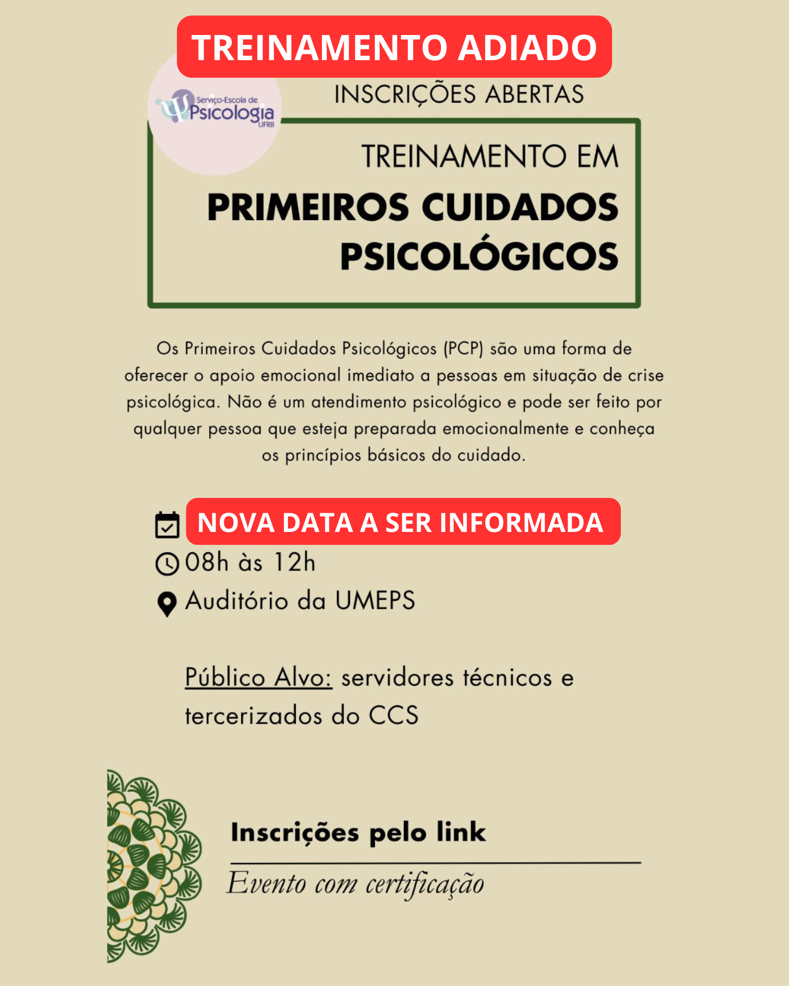**ADIAMENTO DO TREINAMENTO**Inscrições abertas para o Treinamento em Primeiros Cuidados Psicológicos (Público alvo: Servidores técnicos e tercerizados do CCS)