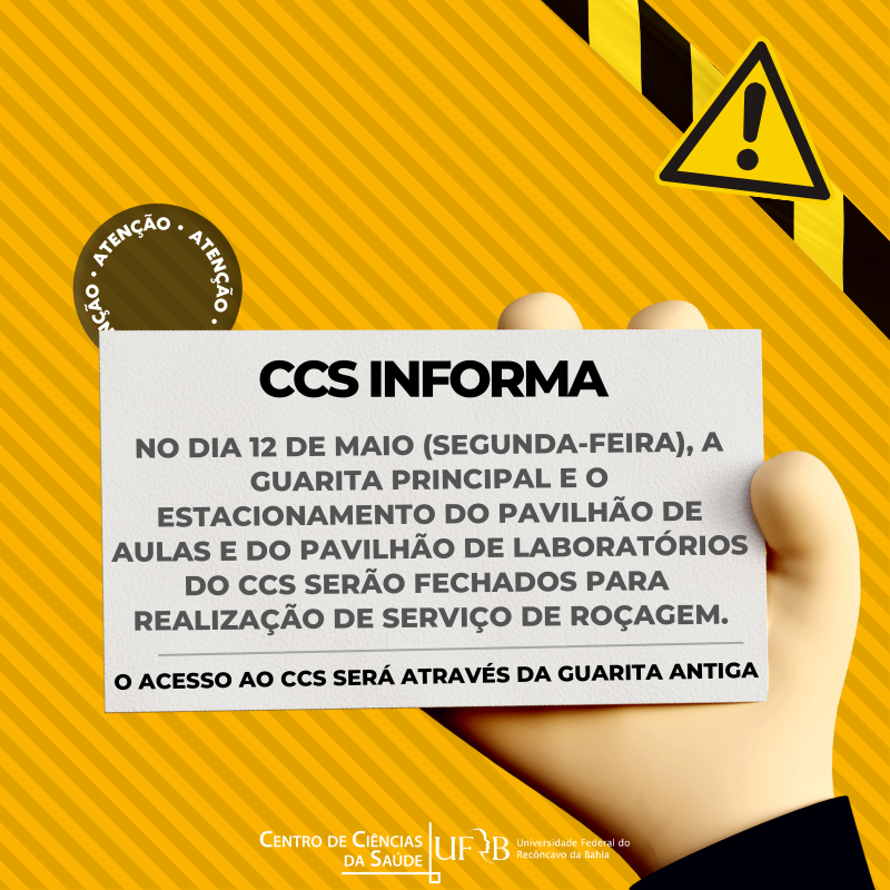 No dia 12 de maio de 2025 (segunda-feira), a guarita principal e o estacionamento do Pavilhão de Aulas e do Pavilhão de Laboratórios do CCS serão fechados para realização de serviço de roçagem. O acesso ao CCS será através da Guarita Antiga.