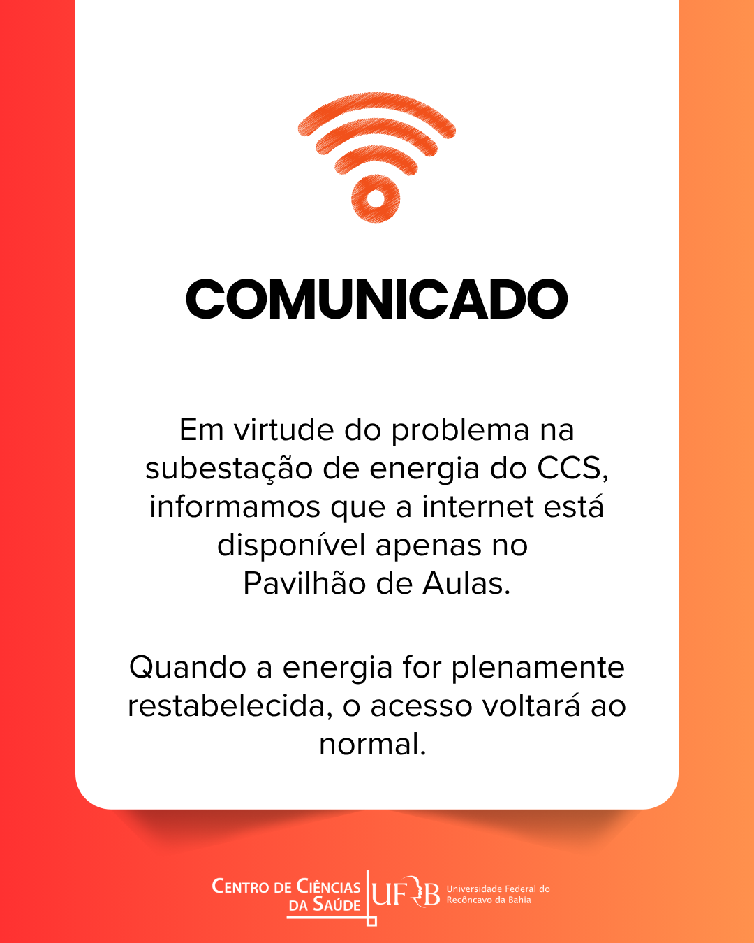 Em virtude do problema na subestação de energia do CCS, informamos que a internet está disponível apenas no Pavilhão de Aulas.