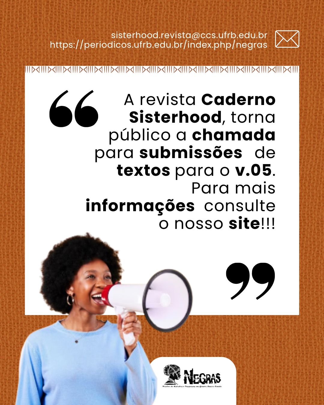O Núcleo de Estudos e Pesquisas em Gênero, Raça e Saúde (NEGRAS), vinculado ao Centro de Ciências da Saúde da UFRB, tem o prazer de anunciar a abertura da V edição do Caderno Sisterhood. Esta publicação semestral acolhe contribuições nas modalidades de artigo acadêmico, resenha, relato de experiência, entrevista e produção artística (poesia, narrativa entre outras), valorizando perspectivas fundamentadas nas intersecções de raça, gênero e saúde. Por meio desta chamada, convidamos pesquisadoras e pesquisadores a enviar seus manuscritos."