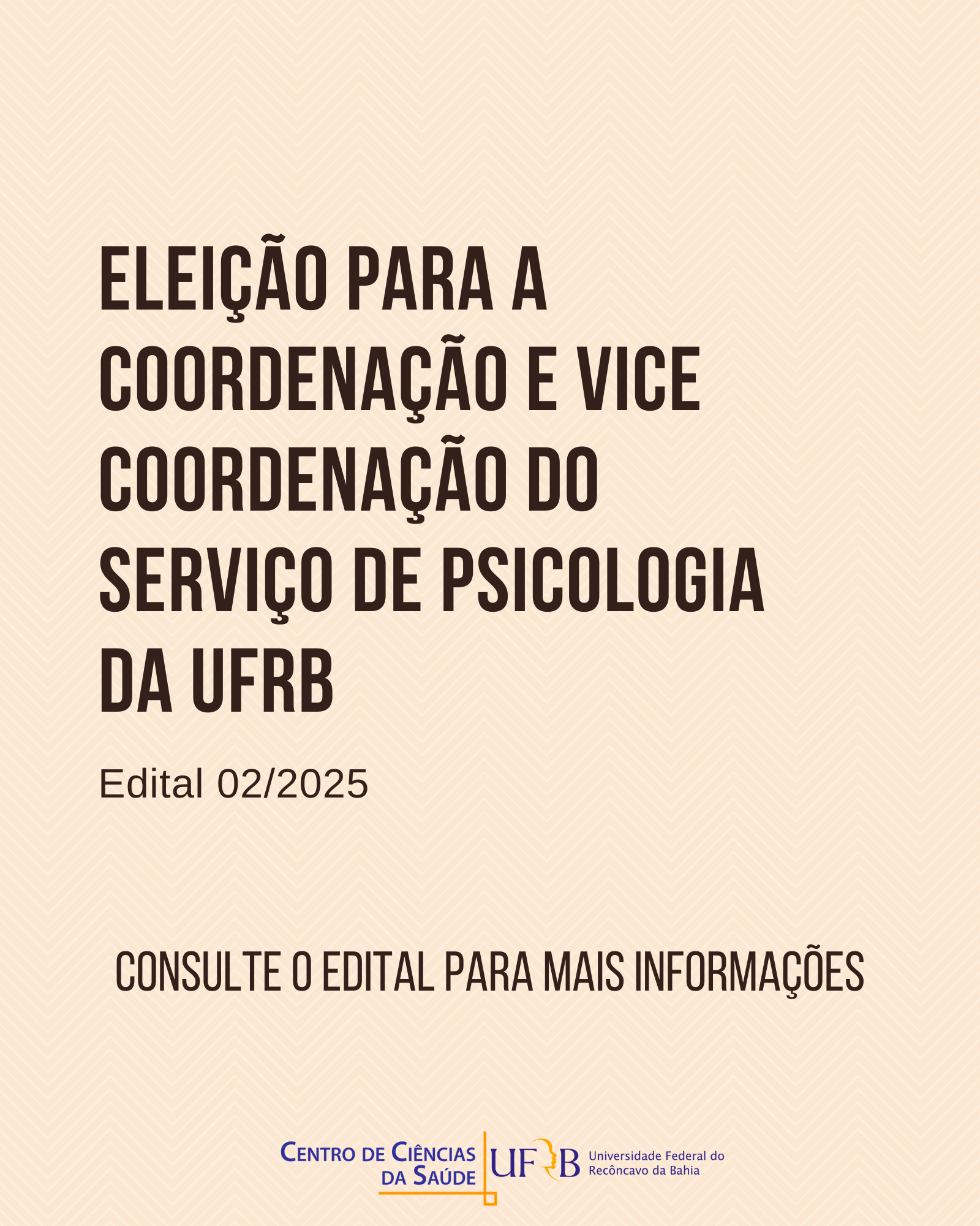 O Colegiado do Curso de Graduação em Psicologia da UFRB, através desta Comissão Eleitoral designada pela Ordem de Serviço nº 02, de 18 de junho de 2025, torna público o presente Edital de Eleição para a Coordenação e Vice coordenação do Serviço de Psicologia da UFRB.