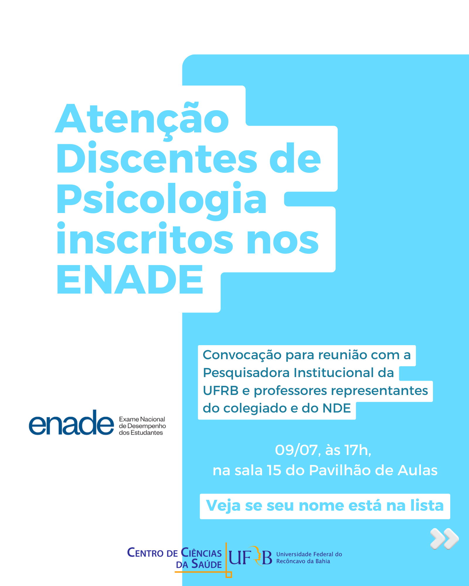 Atenção alunos de Psicologia que estão inscritos no ENADE, vocês estão convocados para uma reunião com a Pesquisadora Institucional da UFRB, e professores representantes do colegiado e do NDE, a ocorrer dia 09/07 às 17h na sala 15 do pavilhão de aulas.