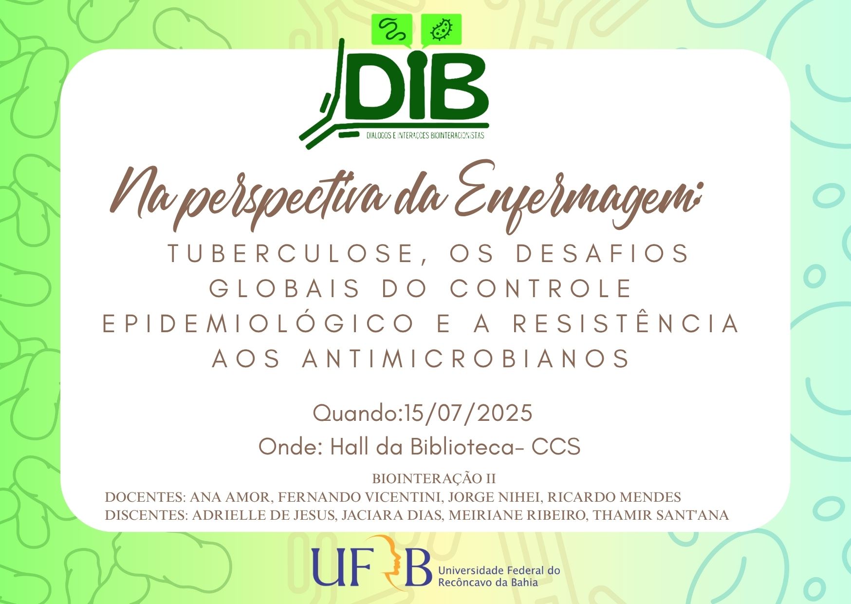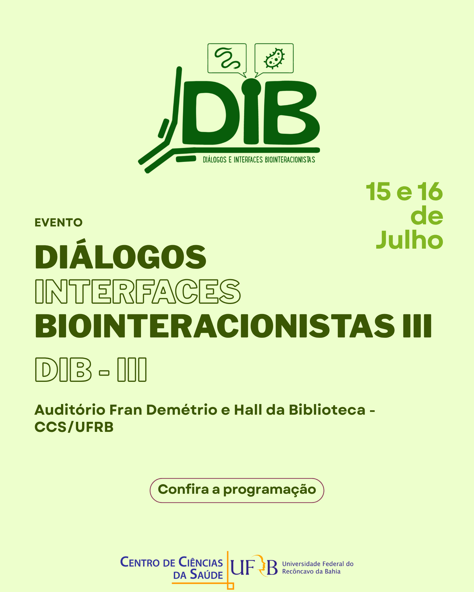 Nos dias 15 e 16 de julho, acontece, no Centro de Ciências da Saúde, o evento "Diálogos e Interfaces Biointeracionistas III". Participe!