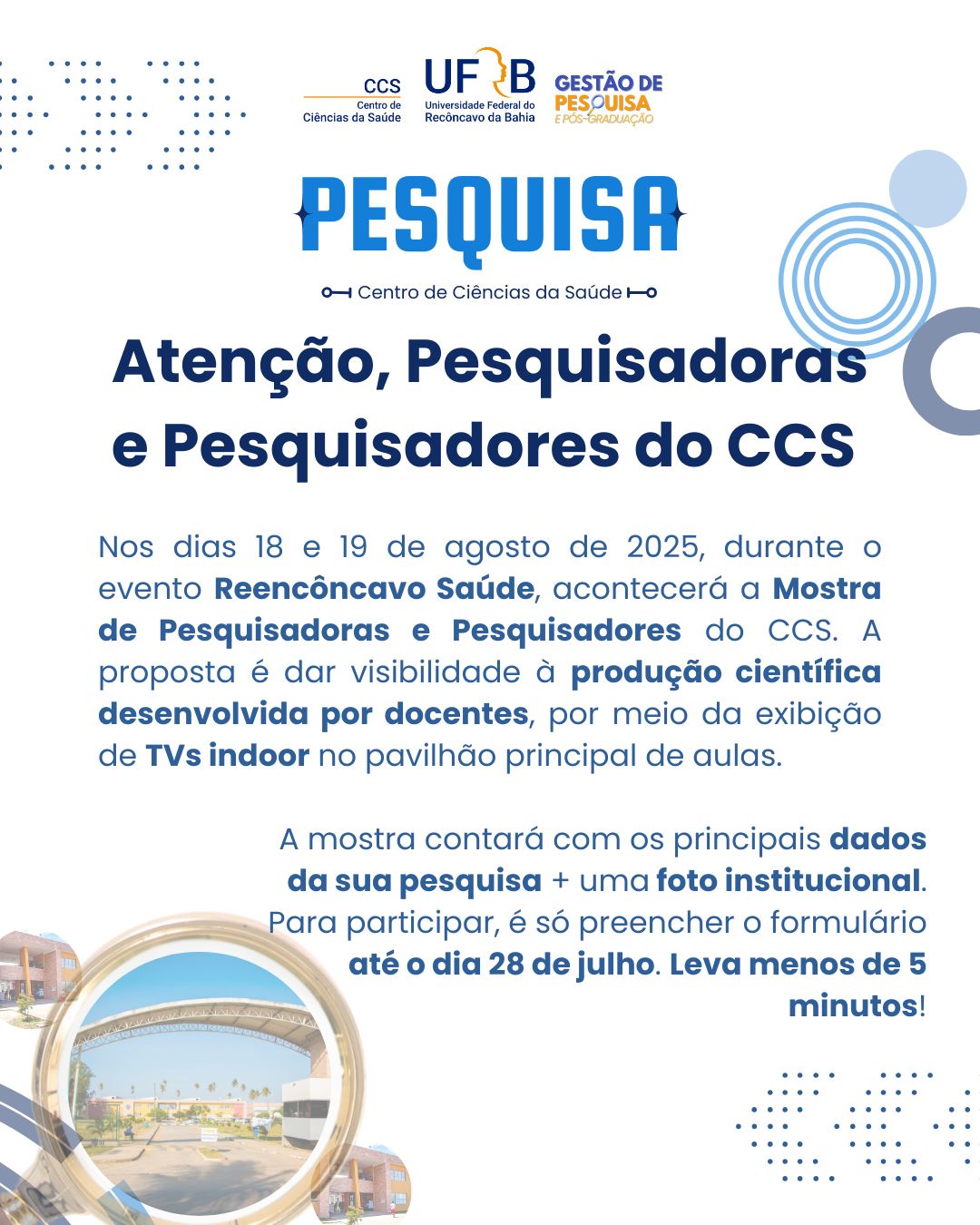 Com intuito de nos conhecermos mais e divulgarmos nossa equipe de pesquisadoras e pesquisadores do CCS, nos dias 18 e 19 de agosto de 2025 durante o Reencôncavo Saúde, teremos uma exposição - TV indoor - no pavilhão principal de aulas .