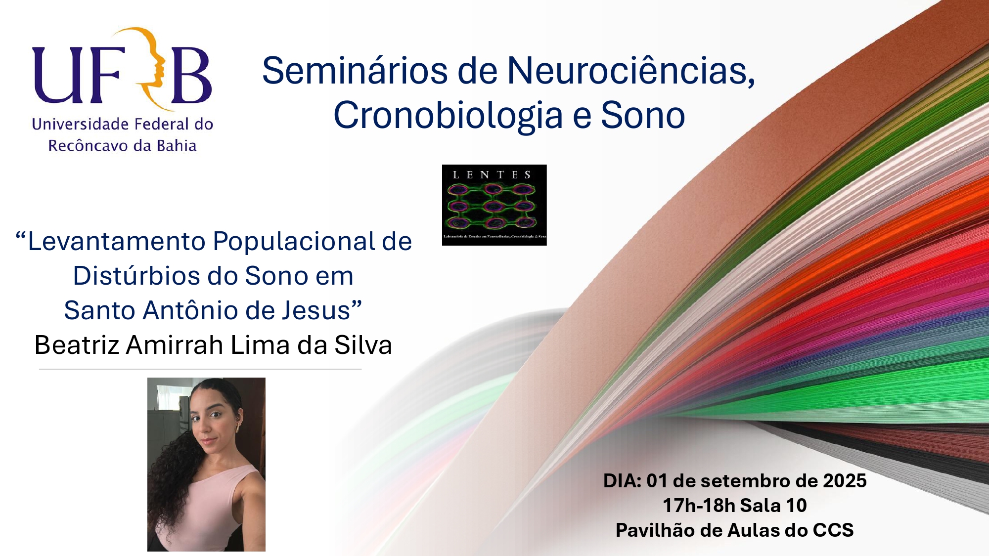 Convidamos a Comunidade Acadêmica do Centro de Ciências da Saúde a prestigiar o Seminário de Neurociências, Cronobiologia e Sono a ser realizado no dia 01 de setembro das 17h às 18h na sala 10 do Pavilhão de Aulas. O tema deste seminário será conduzido pela discente Beatriz Amirrah Lima da Silva. “Levantamento Populacional de Distúrbios do Sono em Santo Antônio de Jesus”