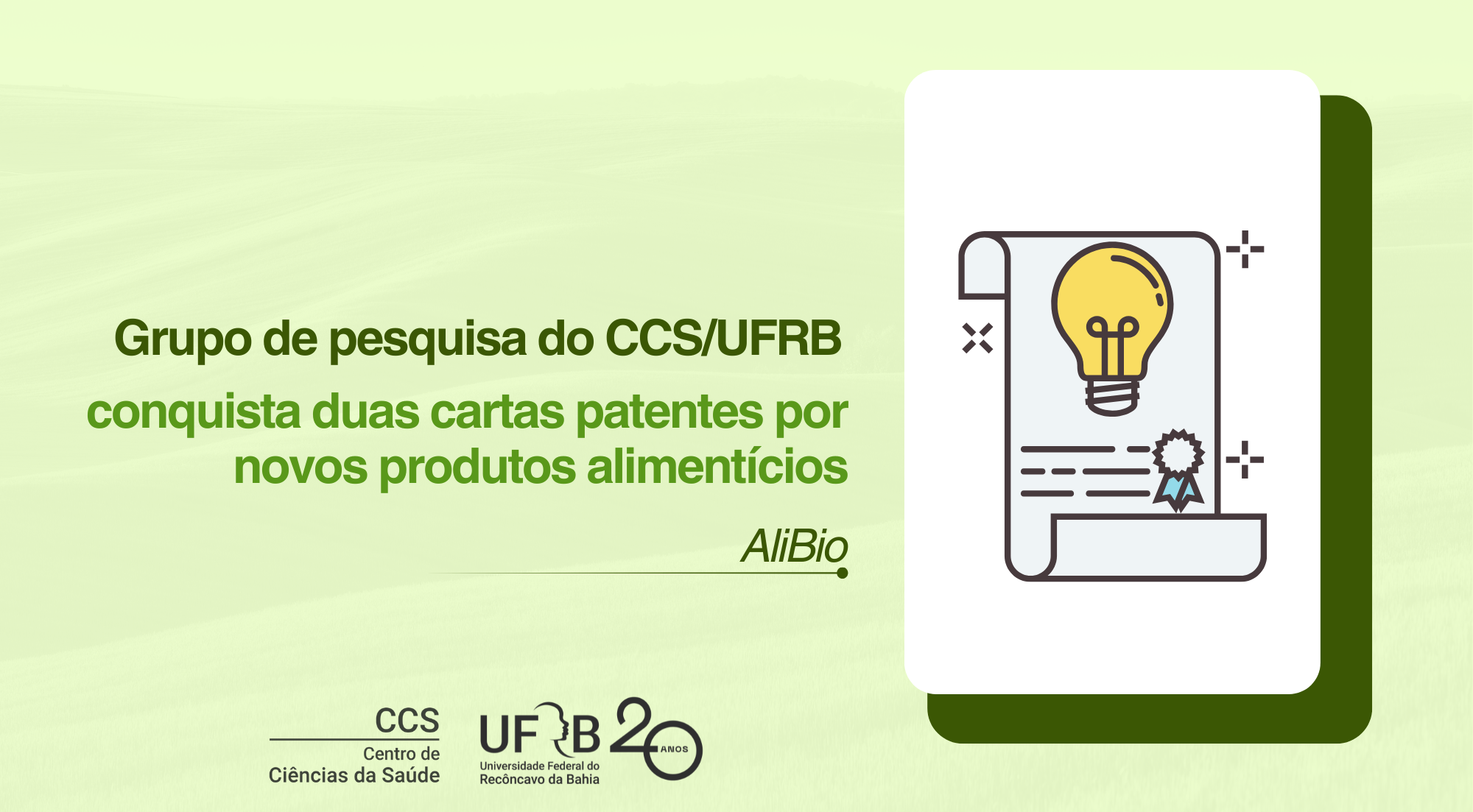A Universidade Federal do Recôncavo da Bahia (UFRB), em parceria com o Instituto Federal do Rio Grande do Sul (IFRS), obteve duas cartas patentes junto ao Instituto Nacional da Propriedade Industrial (INPI) pela formulação e desenvolvimento de novos produtos alimentícios. As concessões referem-se à criação de uma mistura pronta para bolo sabor uva e cacau e uma barra alimentícia funcional prebiótica, com foco em sustentabilidade e saúde.