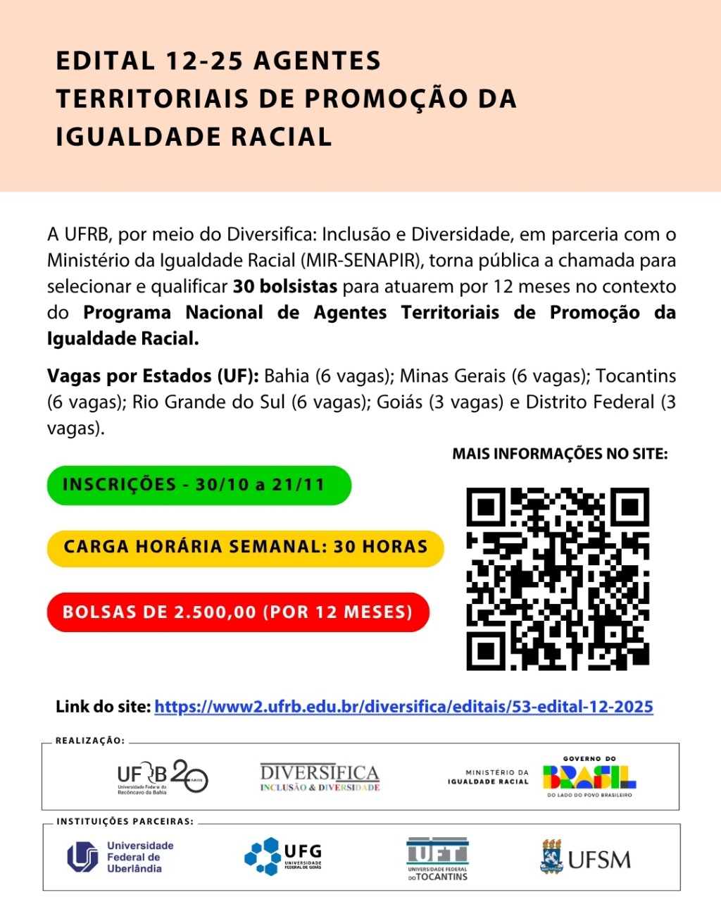 A UFRB, por meio do Diversifica: Inclusão e Diversidade, em parceria com o Ministério da Igualdade Racial (MIR-SENAPIR), torna pública a chamada para selecionar e qualificar 30 bolsistas para atuarem por 12 meses no contexto do Programa Nacional de Agentes Territoriais de Promoção da Igualdade Racial.