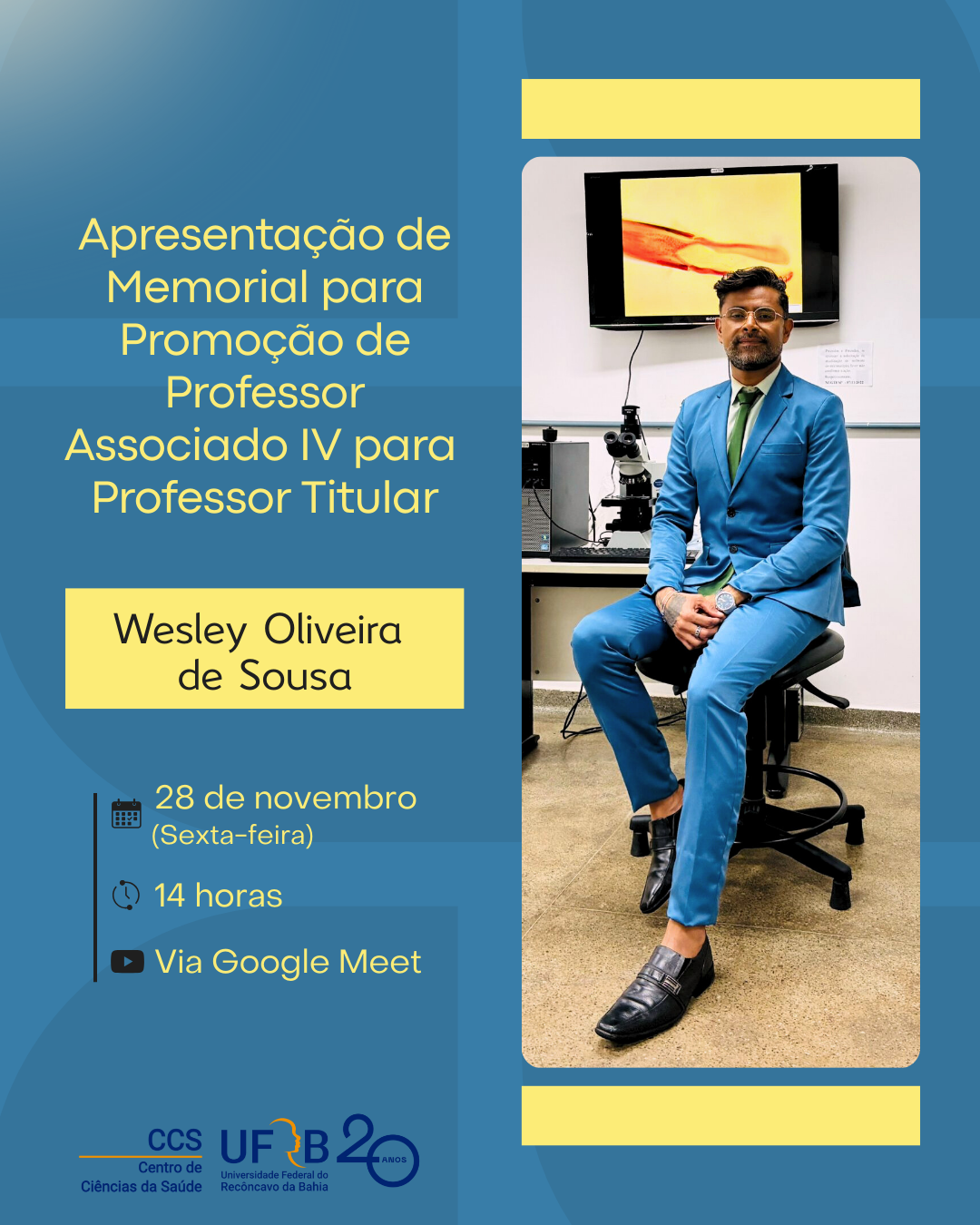 A Direção do Centro de Ciências da Saúde - CCS convida a comunidade acadêmica para a Apresentação de Memorial para Promoção de Professor Associado IV para Professor Titular do Professor Wesley Oliveira de Sousa.