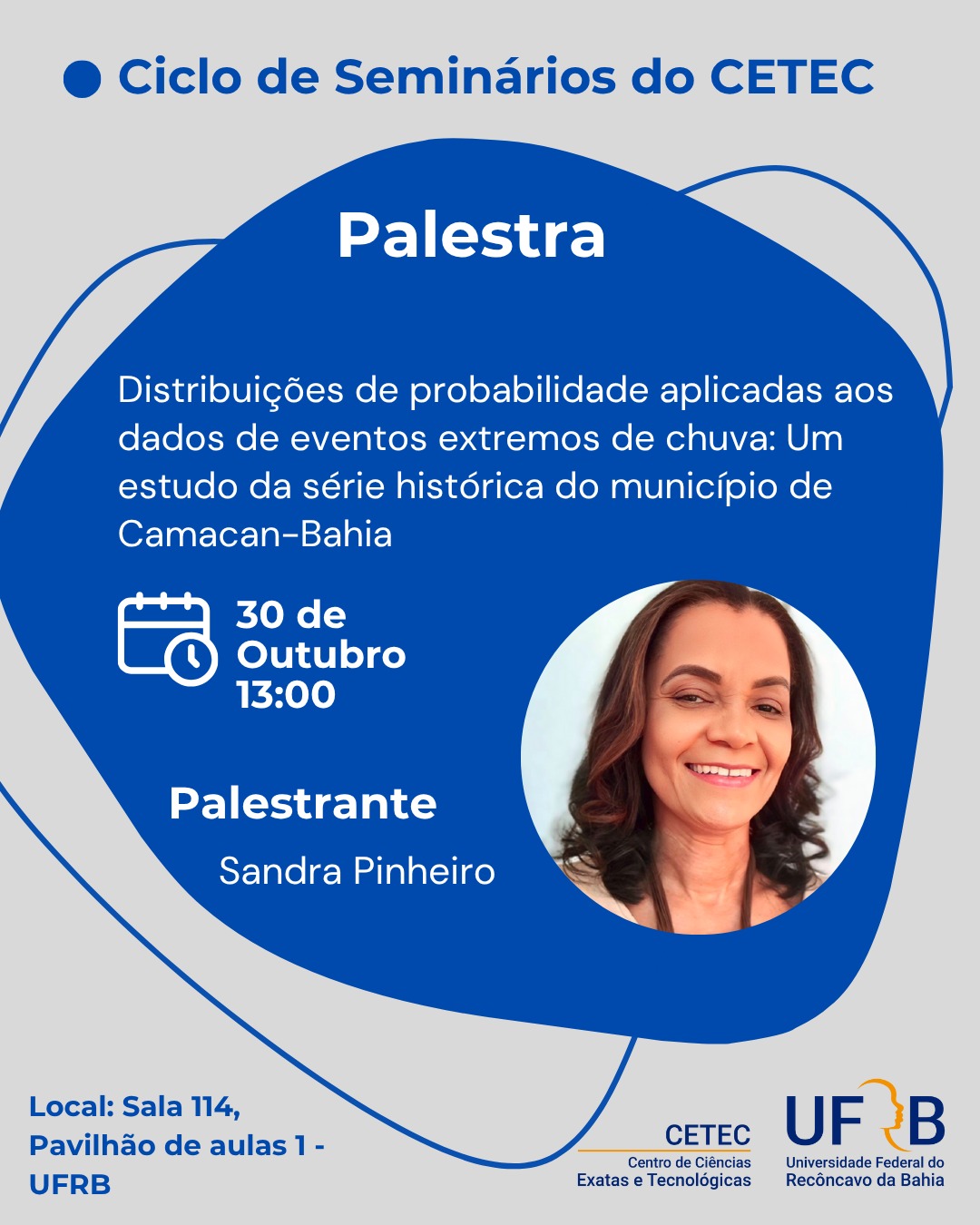 Nesta edição, a palestra será ministrada pela professora Sandra Pinheiro, com o tema: “Distribuição de probabilidade aplicadas aos dados de eventos extremos de chuva: Um estudo da série histórica do município de Camacan-Bahia”.