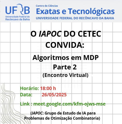 O Grupo de Estudos de IA para Problemas de Otimização Combinatória (IAPOC) do Centro de Ciências Exatas e Tecnológicas (CETEC) convida você para participar do Encontro Virtual...