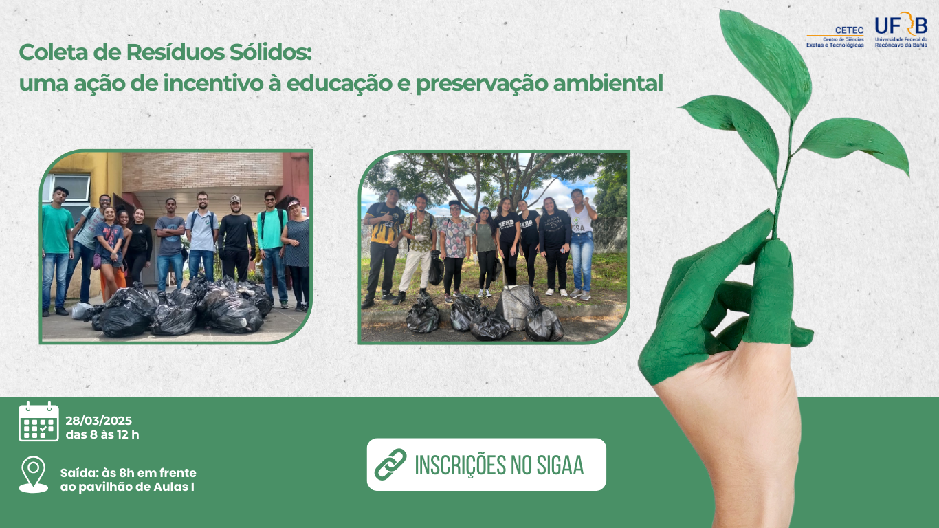 O Centro de Ciências Exatas e Tecnológicas (CETEC) da UFRB convida você a se juntar a nós em um evento especial de Coleta de Resíduos Sólidos, uma iniciativa dedicada à educação e...