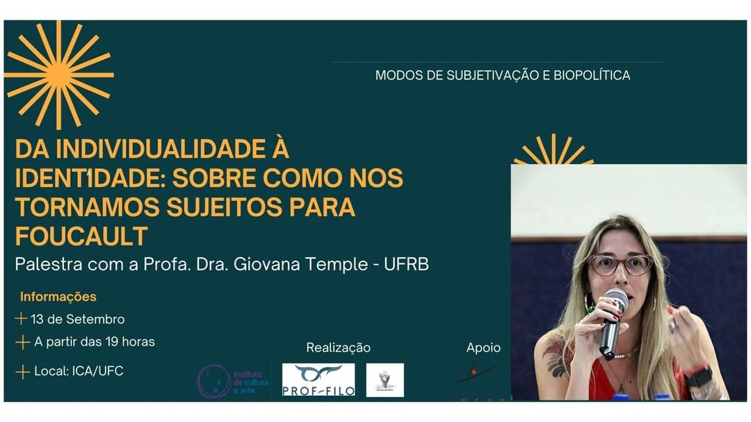 Profa. Giovana Temple (Filosofia UFRB/NUPEF) apresentará palestra intitulada "Da individualidade à identidade: sobre como nos tornamos sujeitos para Foucault", na Universidade Federal do Ceará (UFC), no dia 13 de setembro.