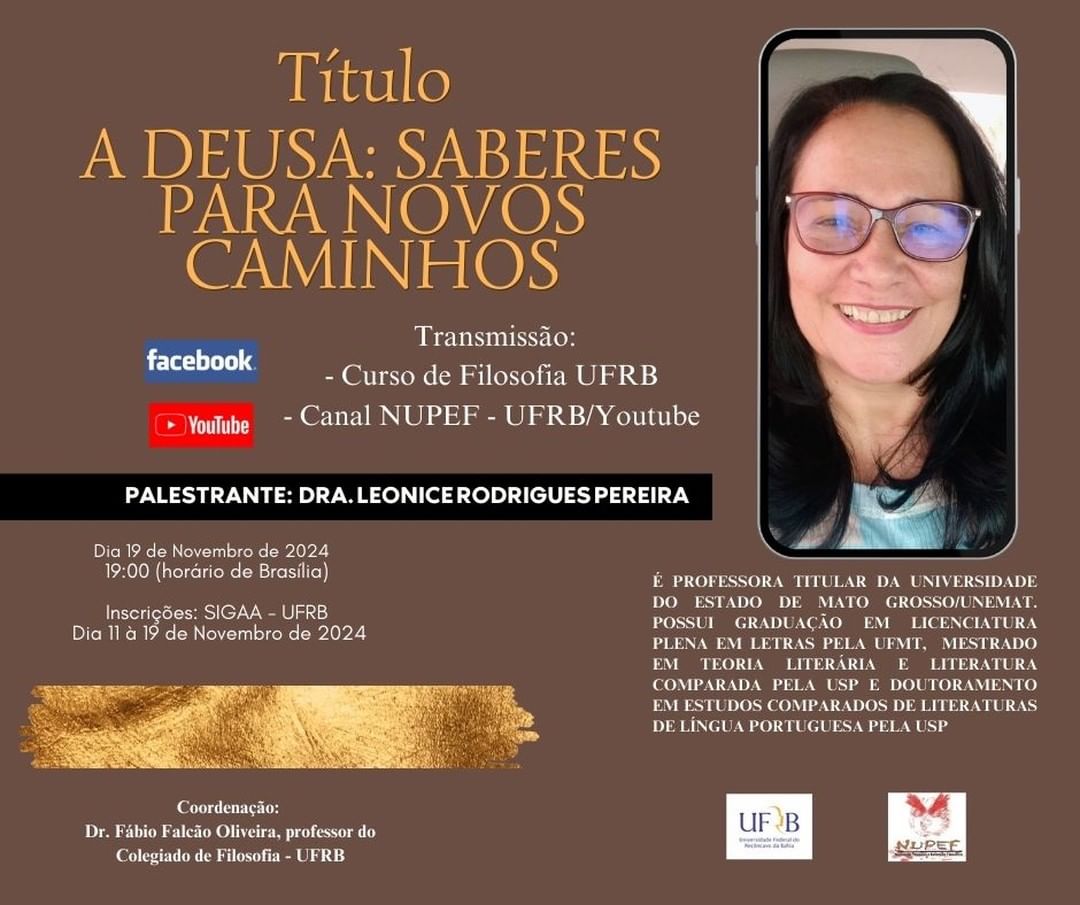 A Palestra terá a participação da Dra. Leonice Rodrigues Pereira professora titular da Universidade do Estado de Mato Grosso na área de literatura de língua Portuguesa do Curso de Letras da Faculdade de Educação e Linguagem, "Campus Jani Vanine" (Cáceres - MT). Nela vamos refletir um pouco sobre a desconstrução das narrativas que preservavam a força do feminino em nossas culturas ancestrais do Período Neolítico, caracterizadas pelas atividades agrícolas. Refere-se, nesta situação, às culturas antigas que traziam, como centro de suas crenças, uma deidade feminina, a Grande Deusa. A convivência entre membros dessas sociedades ancestrais ginocêntricaa se distingue das relações humanas constituídas nas sociedades patriarcais. Assim, o mundo em que Deus “era uma mulher” era caracterizado pelo predomínio da paz, da partilha e da cooperação, em detrimento das ações competitivas, cheias de disputas das sociedades androcêntricas. Dar-se-á atenção ao perfil da Deusa e de seus símbolos presentes na cultura dos povos originários de vários espaços da Europa, Ásia e até do próprio continente Latino-americano. Além de autores como Jean Markale (1997), Rose Marie Muraro (2002), utilizar-se-á, nesta abordagem, os estudos da ativista e pesquisadora Riane Eisler (2007) e da arqueóloga Marija Gimbutas (1997), para fundamentar este trabalho.