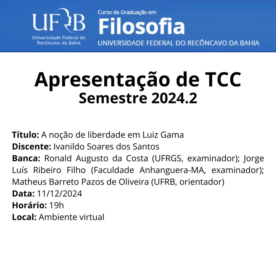 Defesa do Trabalho de Conclusão de Curso (TCC) de Ivanildo Soares dos Santos, integrante do Grupo de Estudos Luiz Gama, intitulado: A noção de liberdade em Luiz Gama.