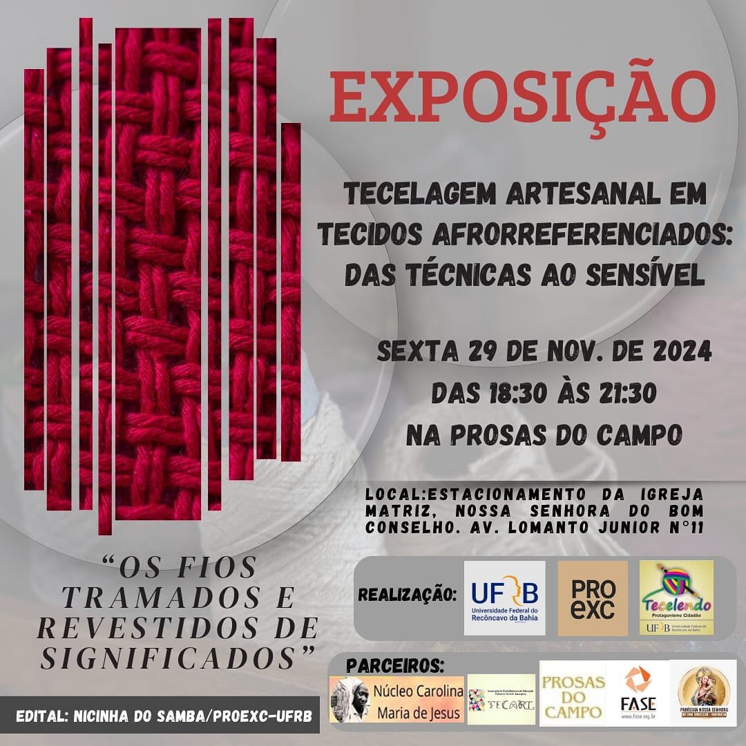 “Tecelagem artesanal em tecidos afroreferenciados: das técnicas ao sensível” é o tema da exposição de arte que acontecerá amanhã, a partir das 18:30, na Prosas do Campo, no estacionamento da Paróquia Nossa Senhora do Bom Conselho, Amargosa, Ba.A exposição é uma das atividades vinculadas ao Projeto de Extensão “Tecelagem Artesanal: das técnicas ao sensível”. O projeto é vinculado ao Programa de Extensão TECELENDO e conta com o apoio das associações TECART e Prosas do Campo.O objetivo principal é promover cursos de tecelagem artesanal entrelaçando sensibilidades e ancestralidades.A proposta faz parte do Edital de apoio a Programas e Projetos de Extensão em Arte e Cultura - Nicinha do Samba - PROEXC/UFRB.