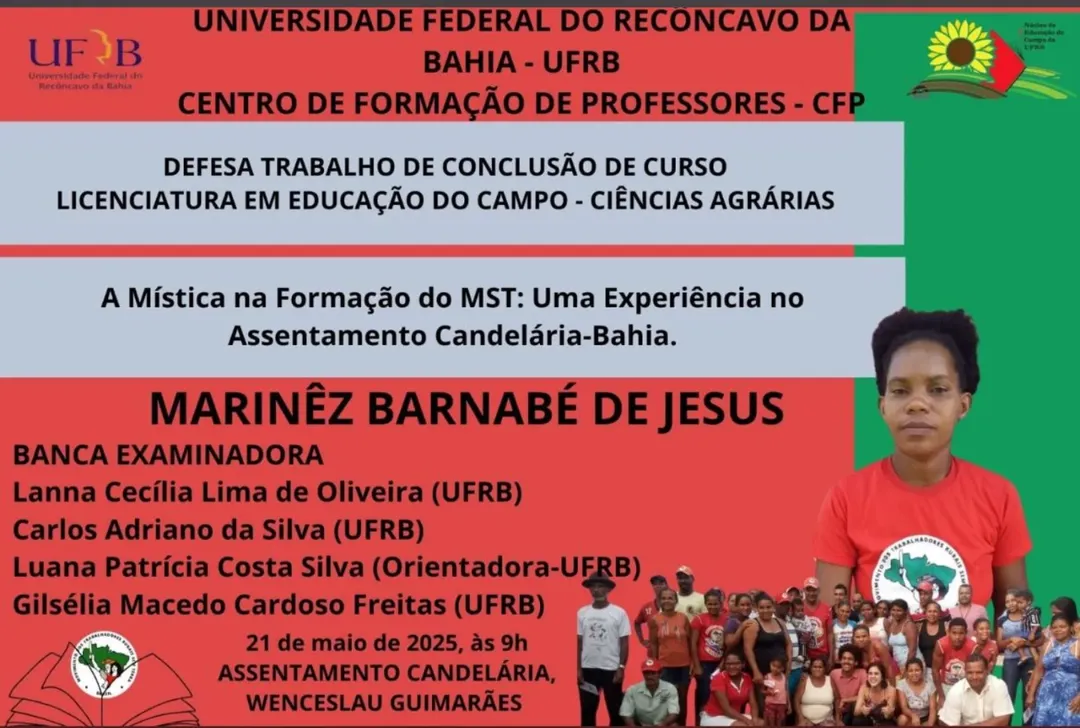 No dia 21 de maio de 2025, às 9h da manhã, será realizada a defesa pública do Trabalho de Conclusão de Curso (TCC) da estudante Marinêz Barnabé de Jesus, do curso de Licenciatura em Educação do Campo com habilitação em Ciências Agrárias, vinculado ao Centro de Formação de Professores da Universidade Federal do Recôncavo da Bahia (UFRB).