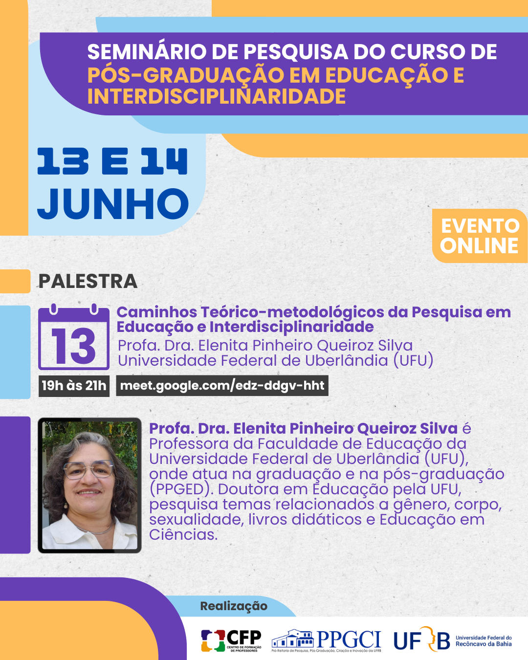 No dia 13 de junho, das 19h às 21h, acontecerá a palestra intitulada “Caminhos Teórico-metodológicos da Pesquisa em Educação e Interdisciplinaridade”, que será ministrada pela Profa. Dra. Elenita Pinheiro Queiroz Silva, da Universidade Federal de Uberlândia (UFU). A professora é doutora em Educação pela UFU, com atuação na graduação e na pós-graduação (PPGED), e realiza pesquisas sobre temas como gênero, corpo, sexualidade, livros didáticos e Educação em Ciências. O link para acesso à palestra é: meet.google.com/edz-ddgv-hht.