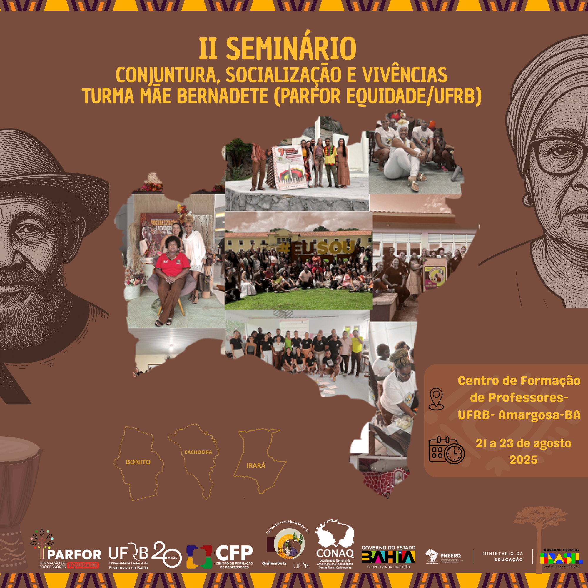 A Coordenação do Curso de Licenciatura em Educação Escolar Quilombola – Turma Mãe Bernadete (PARFOR EQUIDADE UFRB) realiza o II Seminário de Conjuntura, Socialização e Vivências, nos dias 21 a 23 de agosto de 2025, no Centro de Formação de Professores (CFP) da UFRB, Amargosa, Bahia.