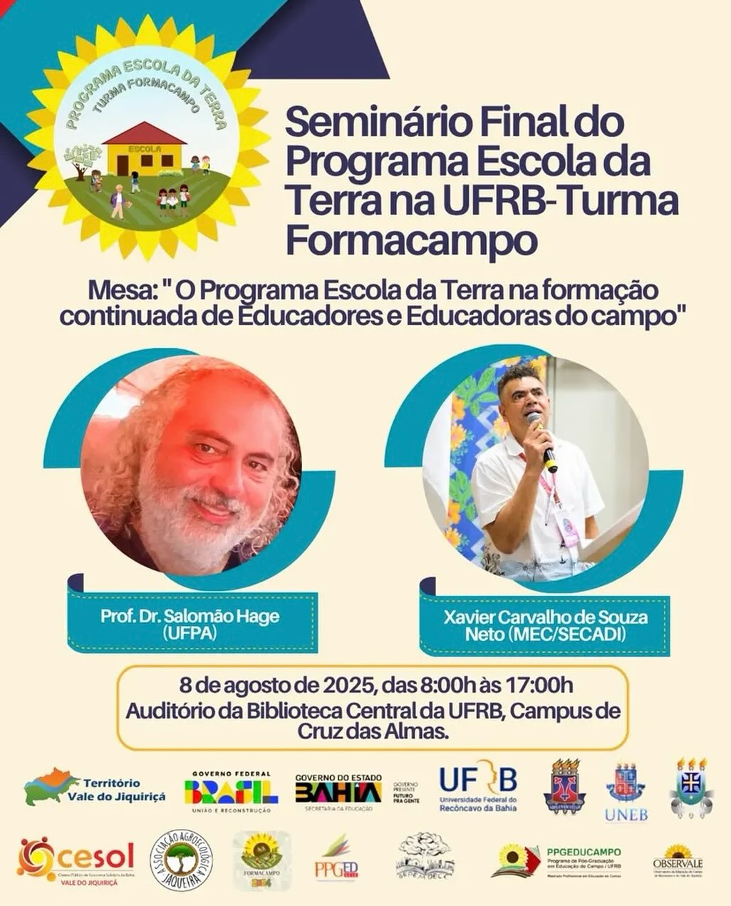 A programação contará com a mesa temática intitulada "O Programa Escola da Terra na formação continuada de Educadores e Educadoras do campo", que terá como palestrantes o Prof. Dr. Salomão Hage, da Universidade Federal do Pará (UFPA), e Xavier Carvalho de Souza Neto, representante do Ministério da Educação (MEC/SECADI). Ambos são referências nacionais na área da Educação do Campo e trarão contribuições fundamentais para o debate.
