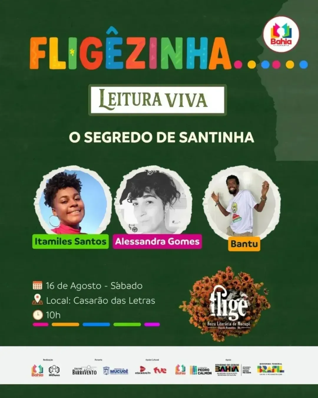 O evento acontece no dia 16 de agosto (sábado), às 10h, no Casarão das Letras, em Mucugê, dentro da programação da FLIGÊ – Feira Literária de Mucugê.