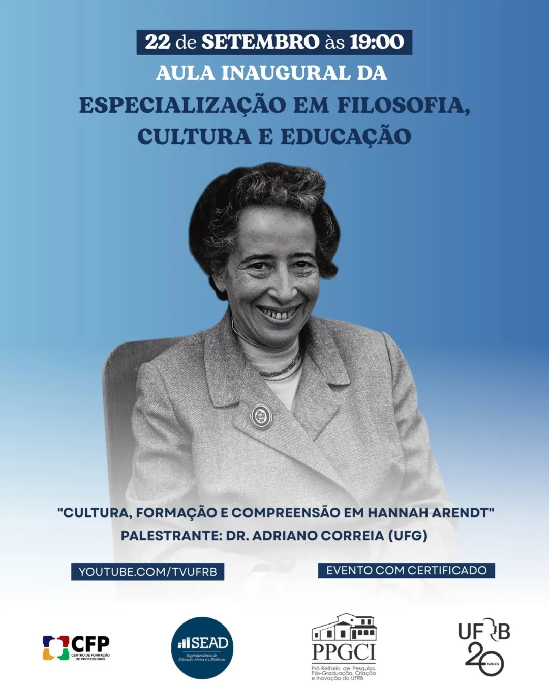 No próximo dia 22/09, às 19 horas, teremos a AULA INAUGURAL DA ESPECIALIZAÇÃO EM FILOSOFIA, CULTURA E EDUCAÇÃO, coordenada pelo Prof. Dr. Pablo Zunino (Filosofia UFRB/NUPEF). O tema da aula será: "Cultura, formação e compreensão em Hannah Arendt", com o Professor Dr. Adriano Correia (UFG). O evento, transmitido pela TV UFRB (Youtube) será aberto ao público e certificará os participantes inscritos pelo SIGAA até a data do evento.