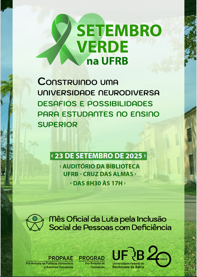 A UFRB, através da Pró-reitoria de Graduação, promove o evento "Setembro Verde na UFRB" Em comemoração ao setembro verde, mês dedicado à Pessoa com Deficiência e conscientização sobre a importância da inclusão.