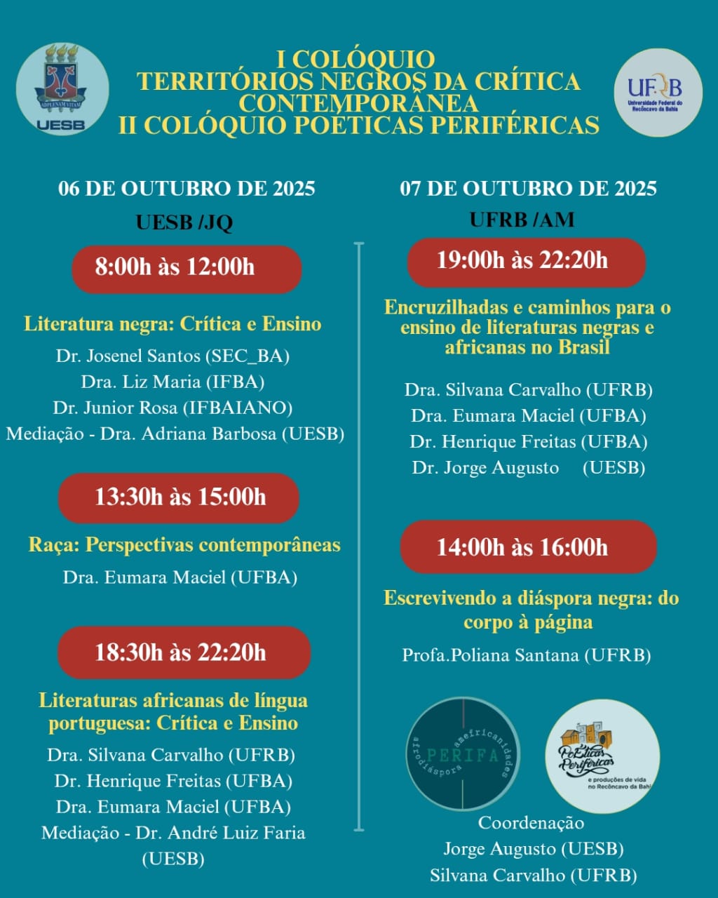 O II Colóquio PoÉticas Periféricas: Lei 10.639/2003, formação de professores e ensino de Literatura tem como objetivo dar continuidade à divulgação, discussão e fortalecimento das pesquisas voltadas para a formação de professores no âmbito da literatura e da cultura, tomando como referência o pensamento negro-brasileiro e africano. A atividade é desenvolvida em pareceria com o grupo de pesquisa PoÉticas Periféricas/CNPQ/UFRB) e I Colóquio Territórios Negros da Crítica Contemporânea: ensino de literaturas africanas e negro-brasileiras, organizado pelo grupo de pesquisa PERIFA/CNPQ/UESB.