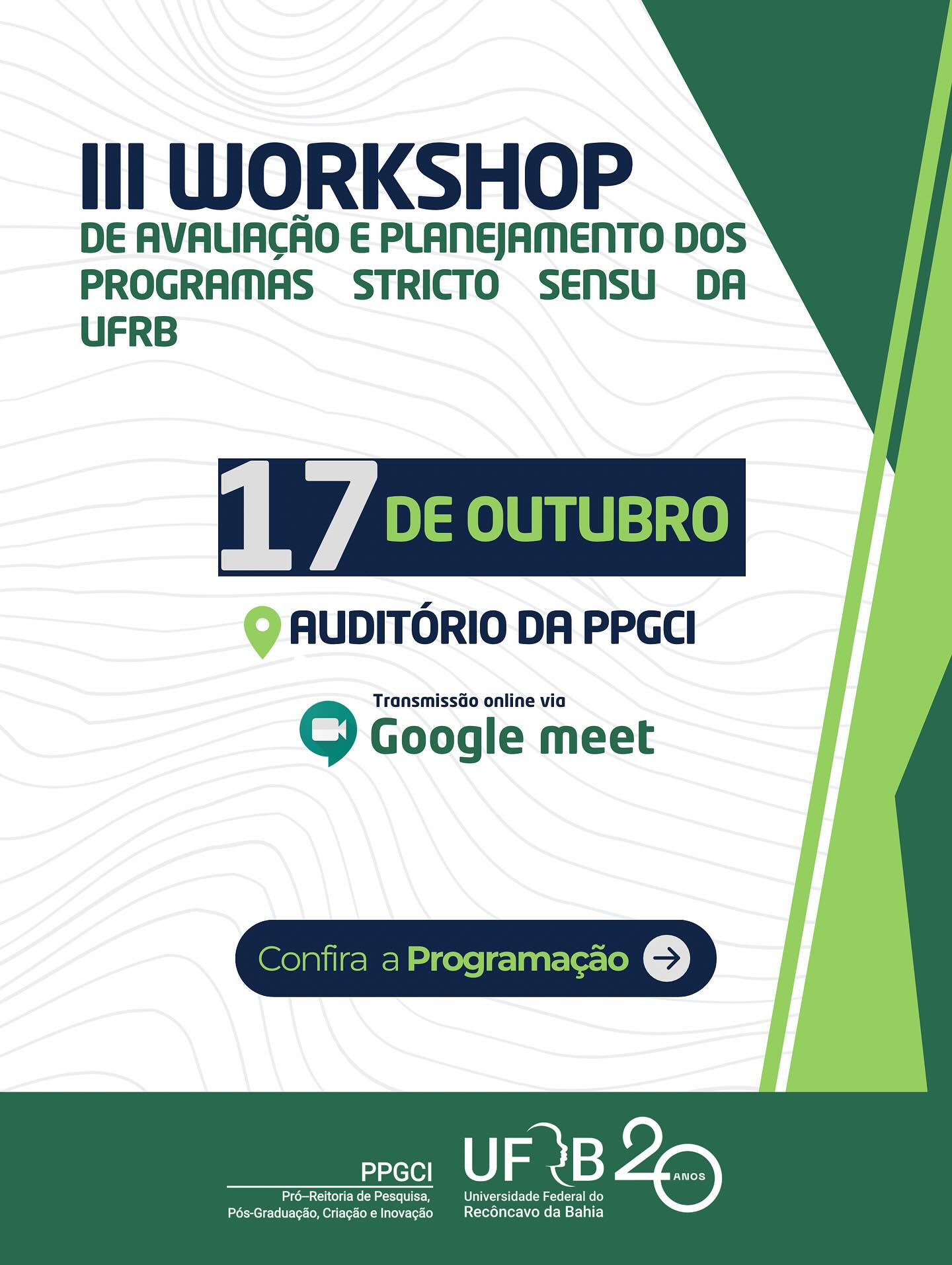 No dia 17 de outubro de 2025, a partir das 8h30, acontece o III Workshop de Autoavaliação e Planejamento dos Programas de Pós-Graduação da UFRB.O evento contará com a presença do Prof. Dr. Antônio Gomes, Diretor de Avaliação da CAPES, que irá abordar temas fundamentais para o fortalecimento da pós-graduação, como a nova ficha de avaliação, o GOPG, os APCNs, entre outros assuntos essenciais à gestão e ao planejamento dos programas.A participação de coordenadores(as), docentes e equipes envolvidas na elaboração de novos APCNs é fundamental para o avanço e aprimoramento da pós-graduação em nossa instituição.Data: 17 de outubro de 2025Horário: a partir das 8h30Local: Auditório da PPGCI e transmissão via Google Meet