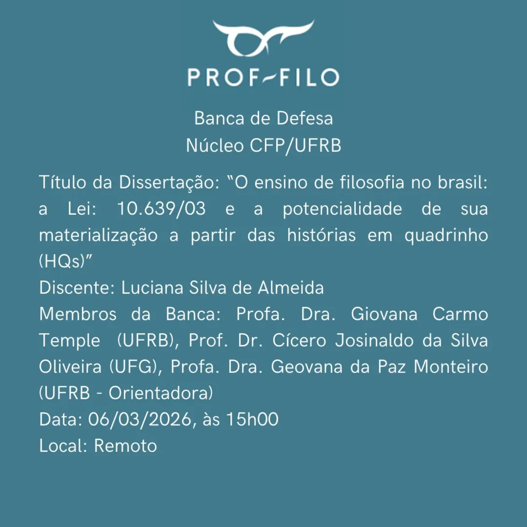Título da Dissertação: "O ensino de filosofia no brasil: a Lei: 10.639/03 e a potencialidade de sua materialização a partir das histórias em quadrinho (HQs)"