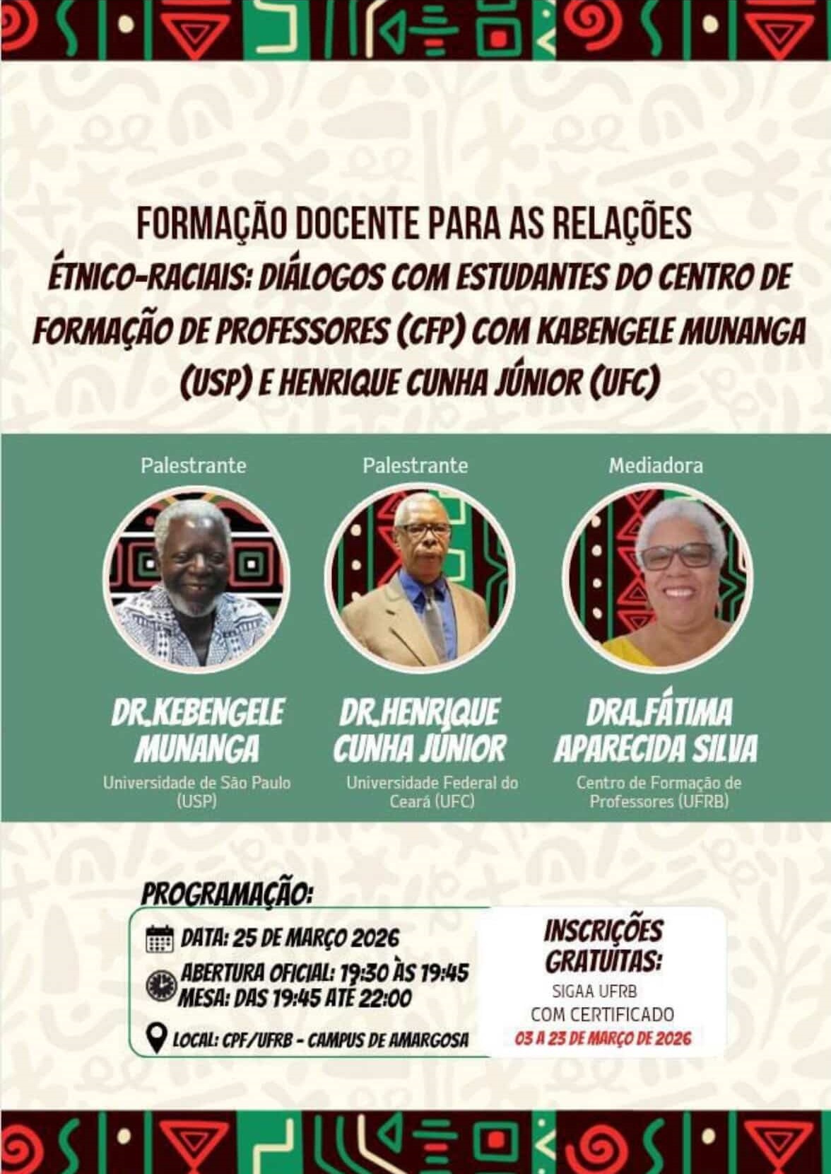 O Centro de Formação de Professores (CFP/UFRB) convida toda a comunidade acadêmica para um encontro fundamental de reflexão e resistência. O evento "Formação Docente para as Relações Étnico-Raciais: Diálogos com Estudantes" busca problematizar as questões raciais no Brasil e seus impactos educacionais, reafirmando o compromisso com uma educação antirracista.
