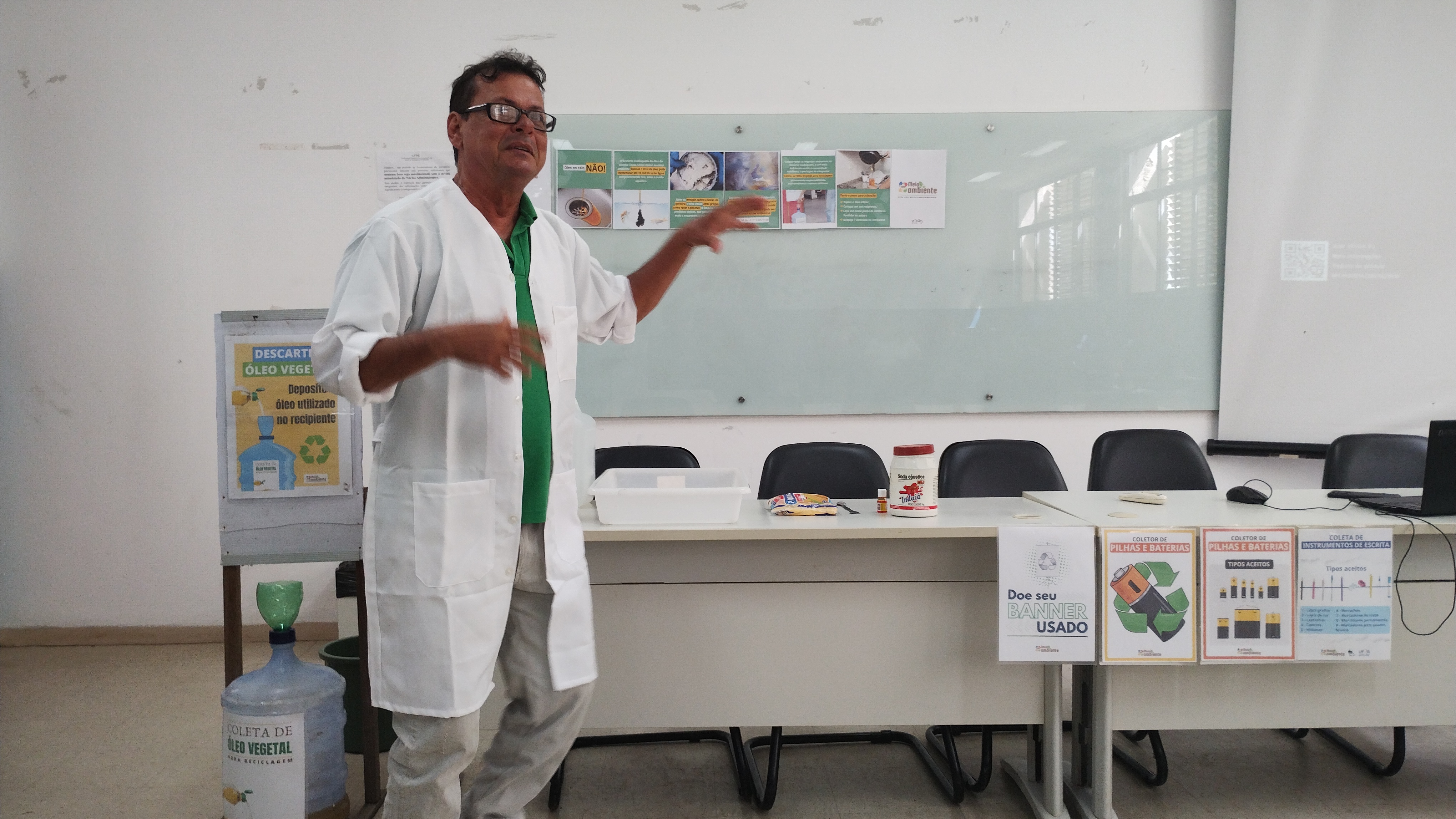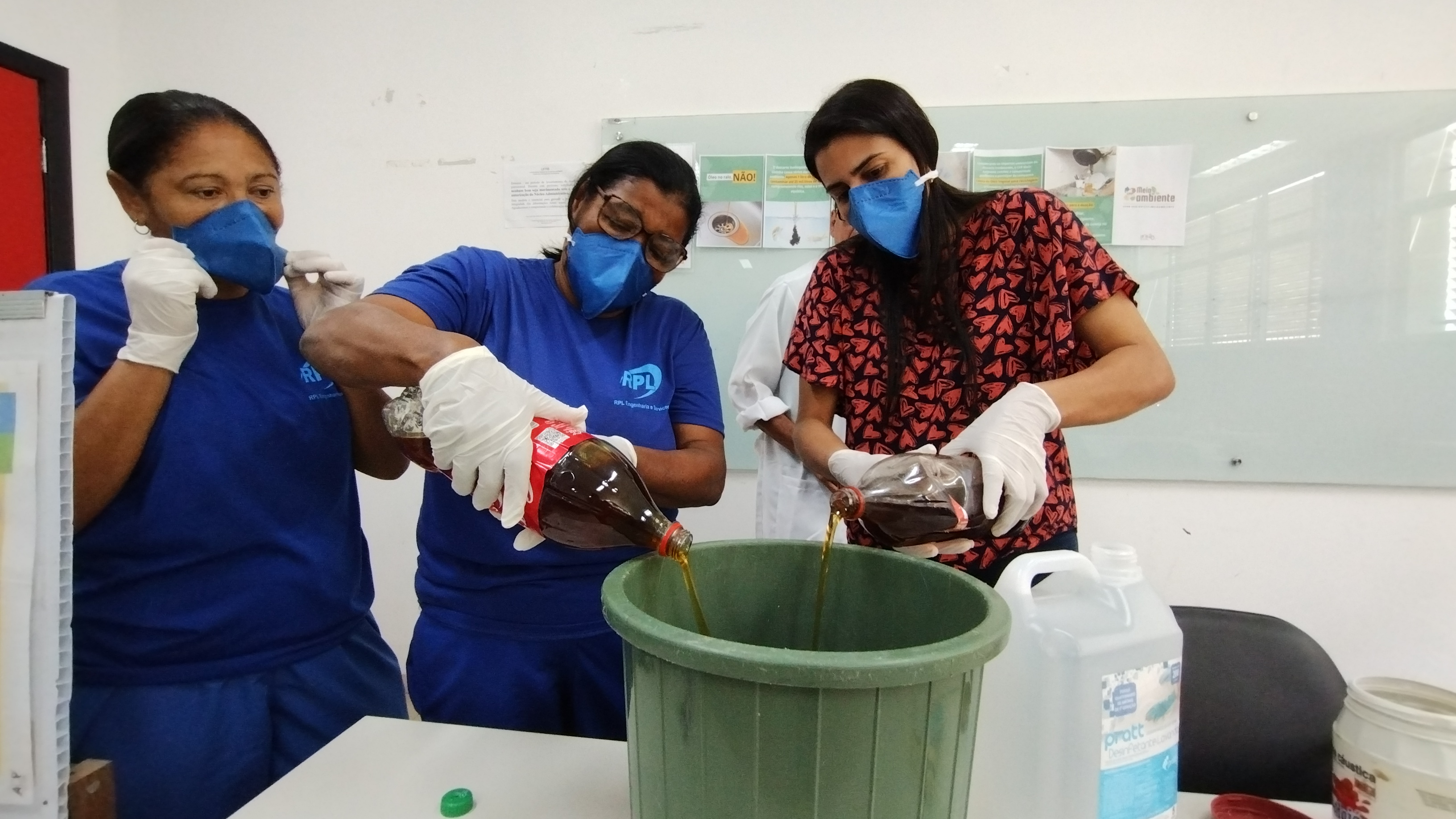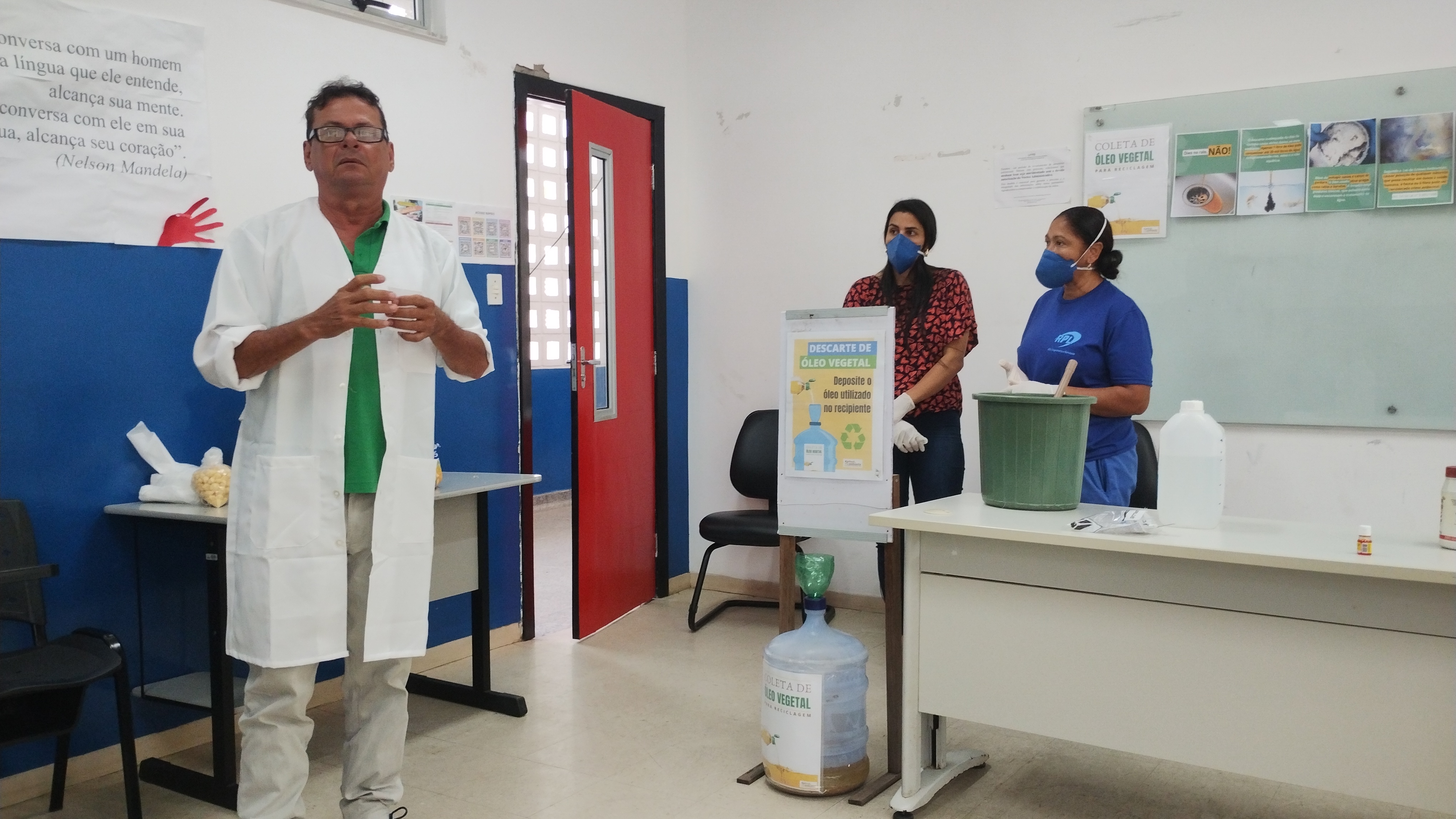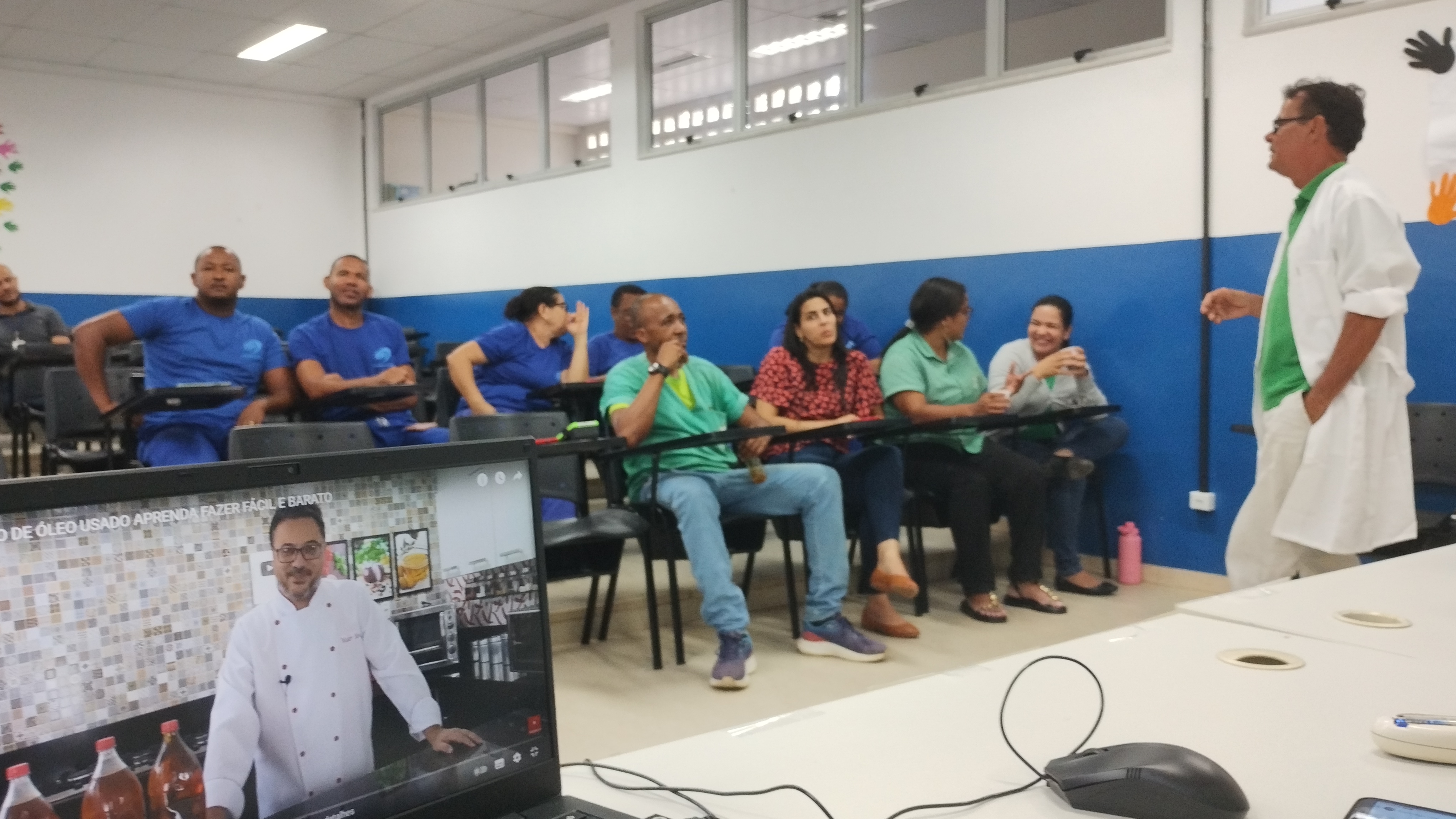 Durante a oficina, Evandro destacou a importância do descarte correto do óleo de cozinha, explicando que, mesmo em pequenas quantidades, ele pode contaminar grandes volumes de água, além de solidificar e causar entupimentos em encanamentos e caixas de gordura, gerando mau cheiro e atraindo insetos e roedores.