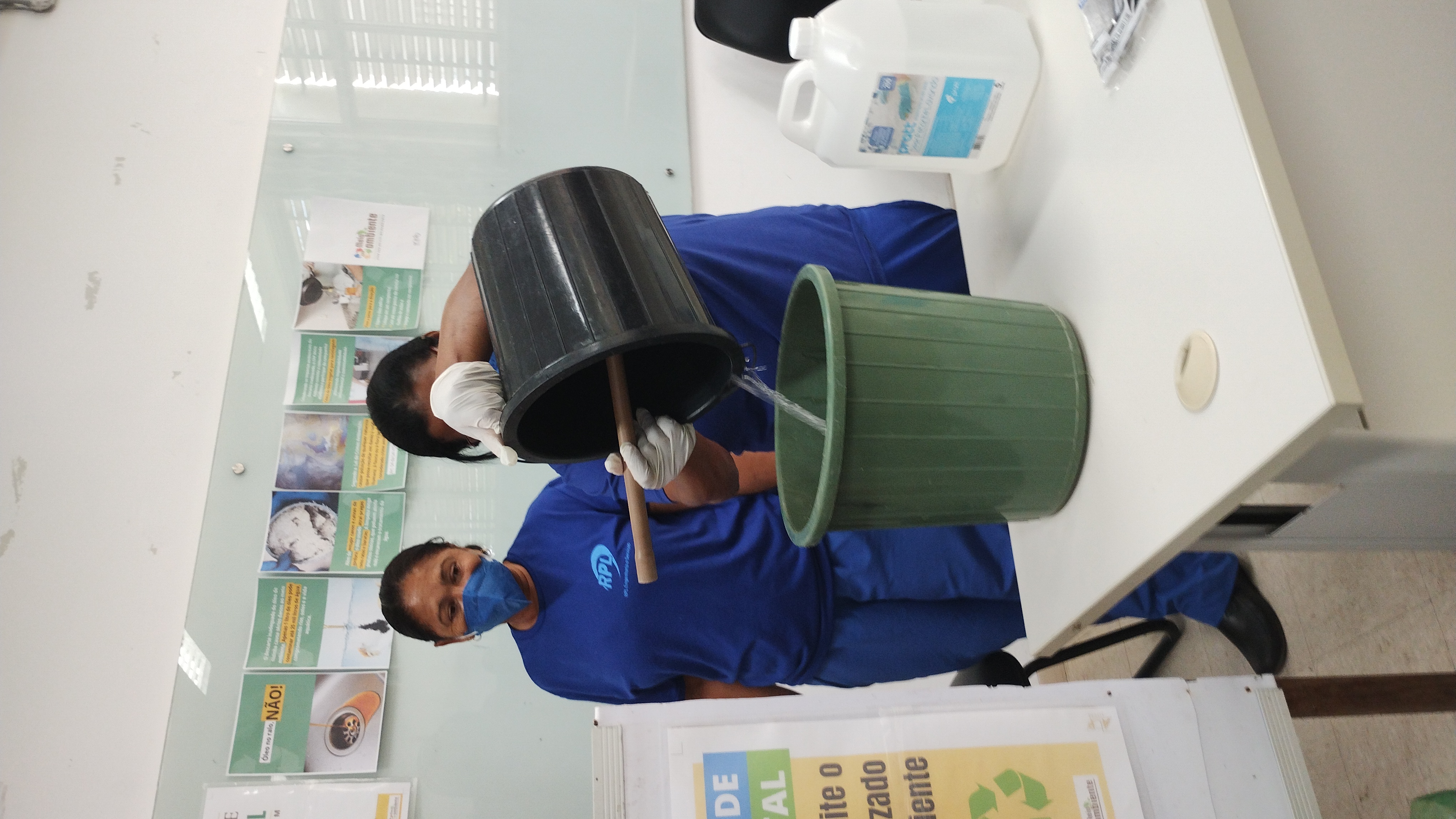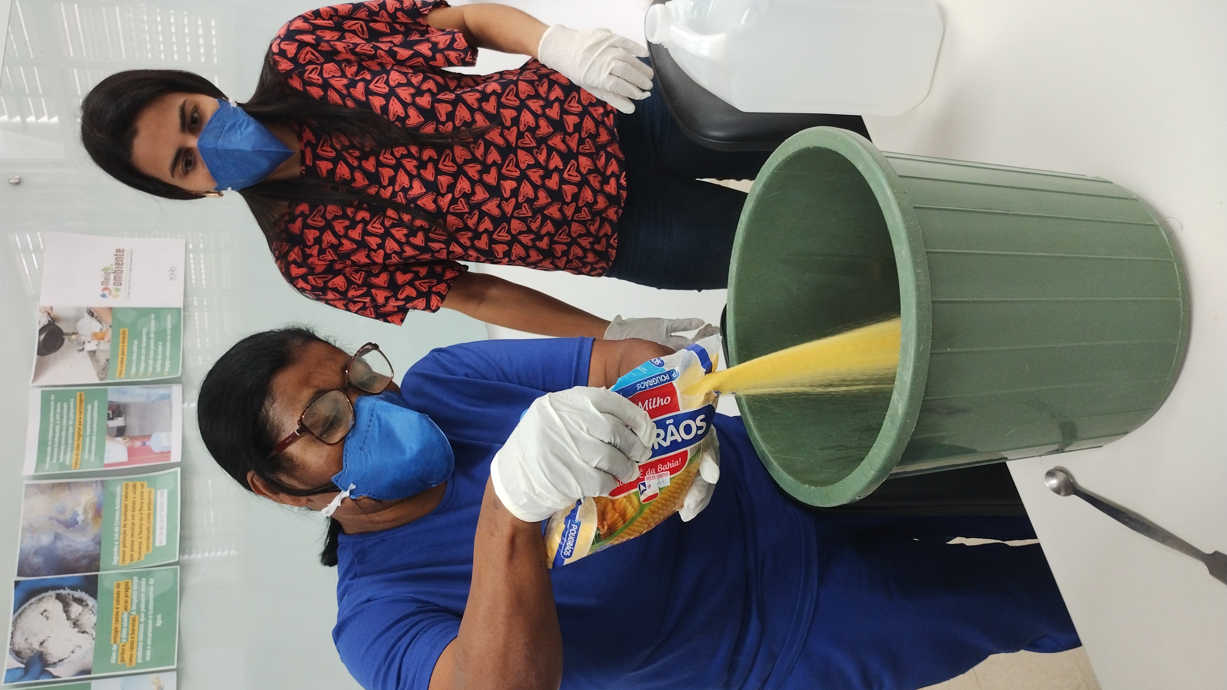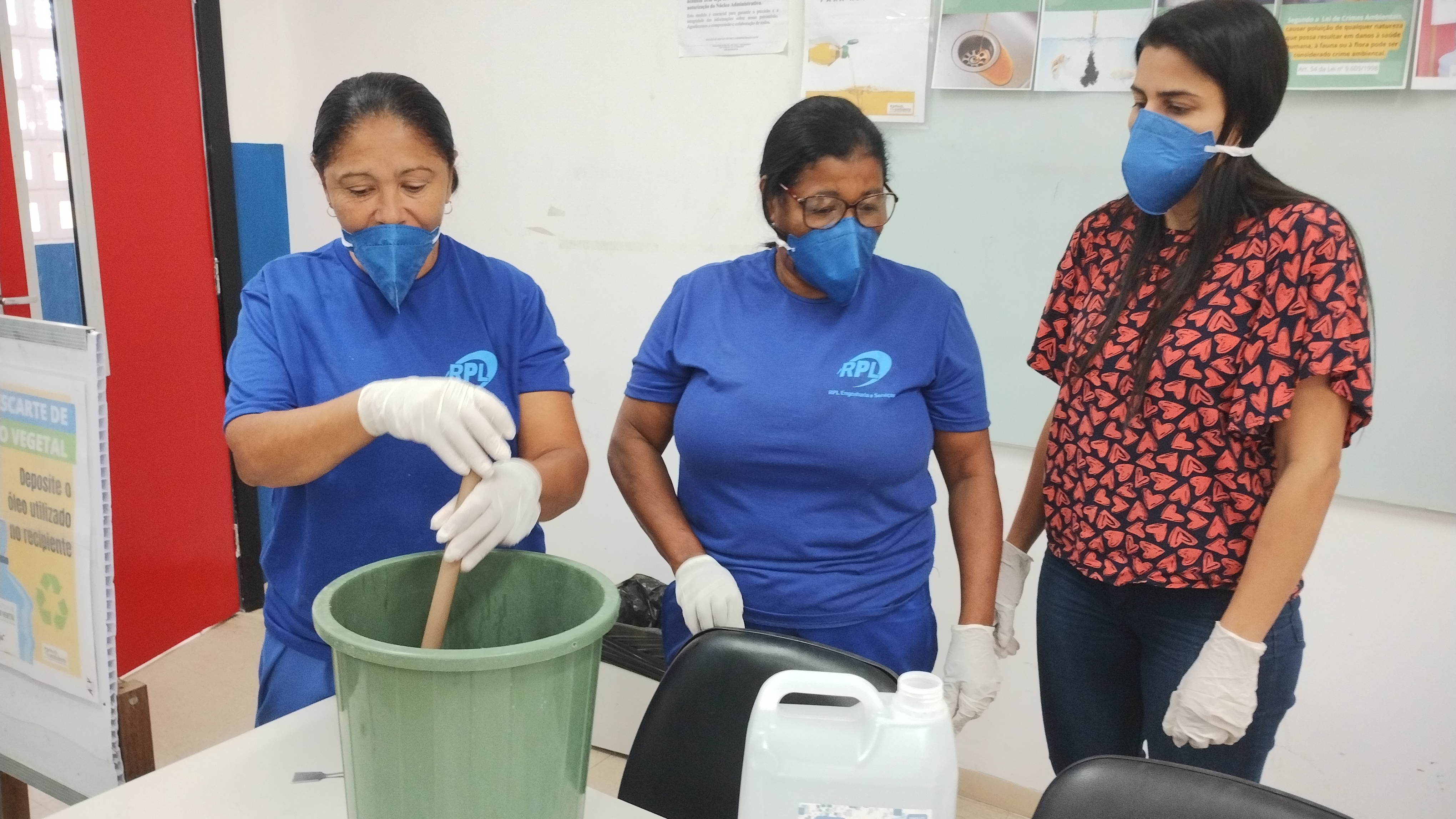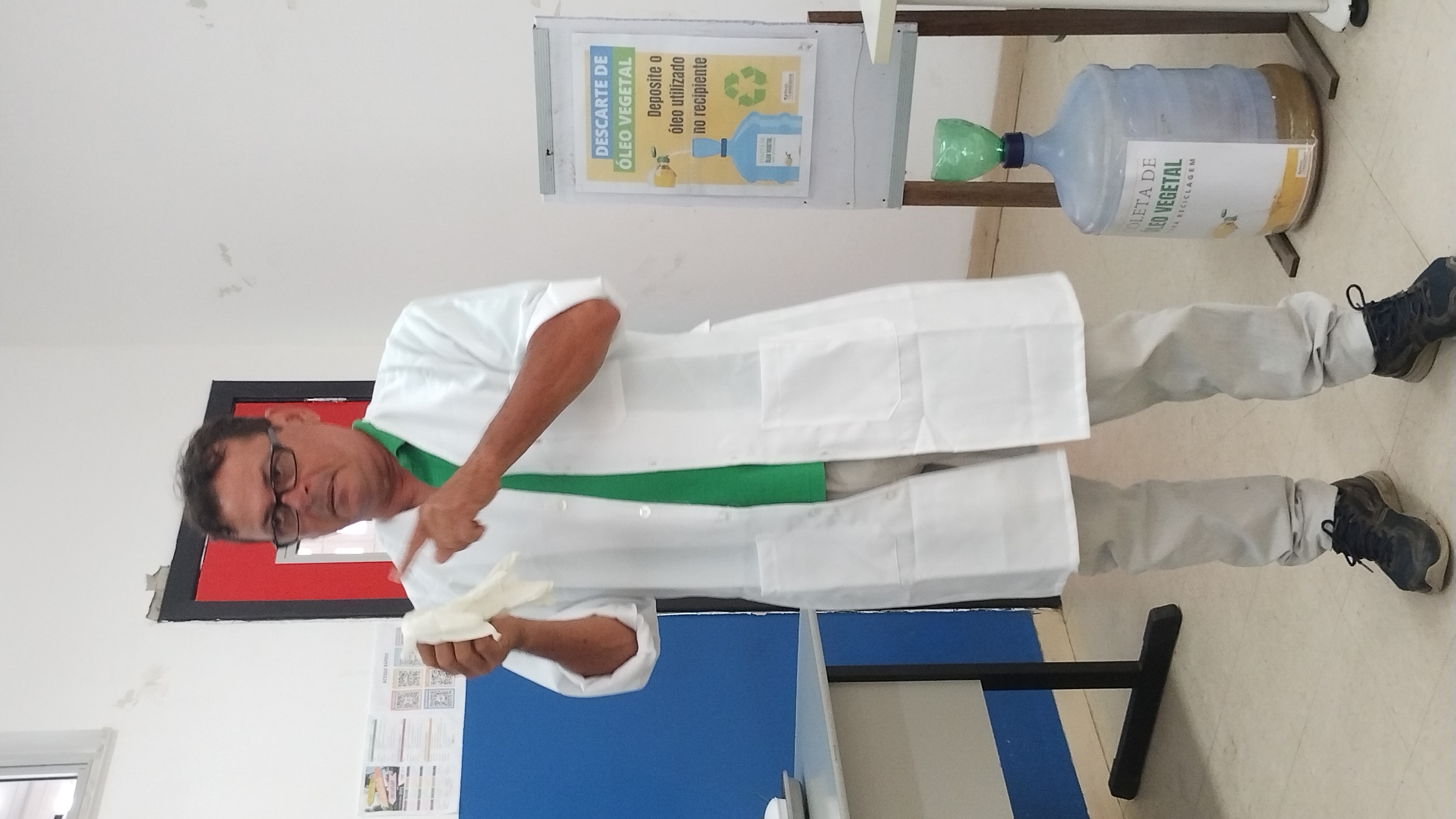 Durante a oficina, Evandro destacou a importância do descarte correto do óleo de cozinha, explicando que, mesmo em pequenas quantidades, ele pode contaminar grandes volumes de água, além de solidificar e causar entupimentos em encanamentos e caixas de gordura, gerando mau cheiro e atraindo insetos e roedores.