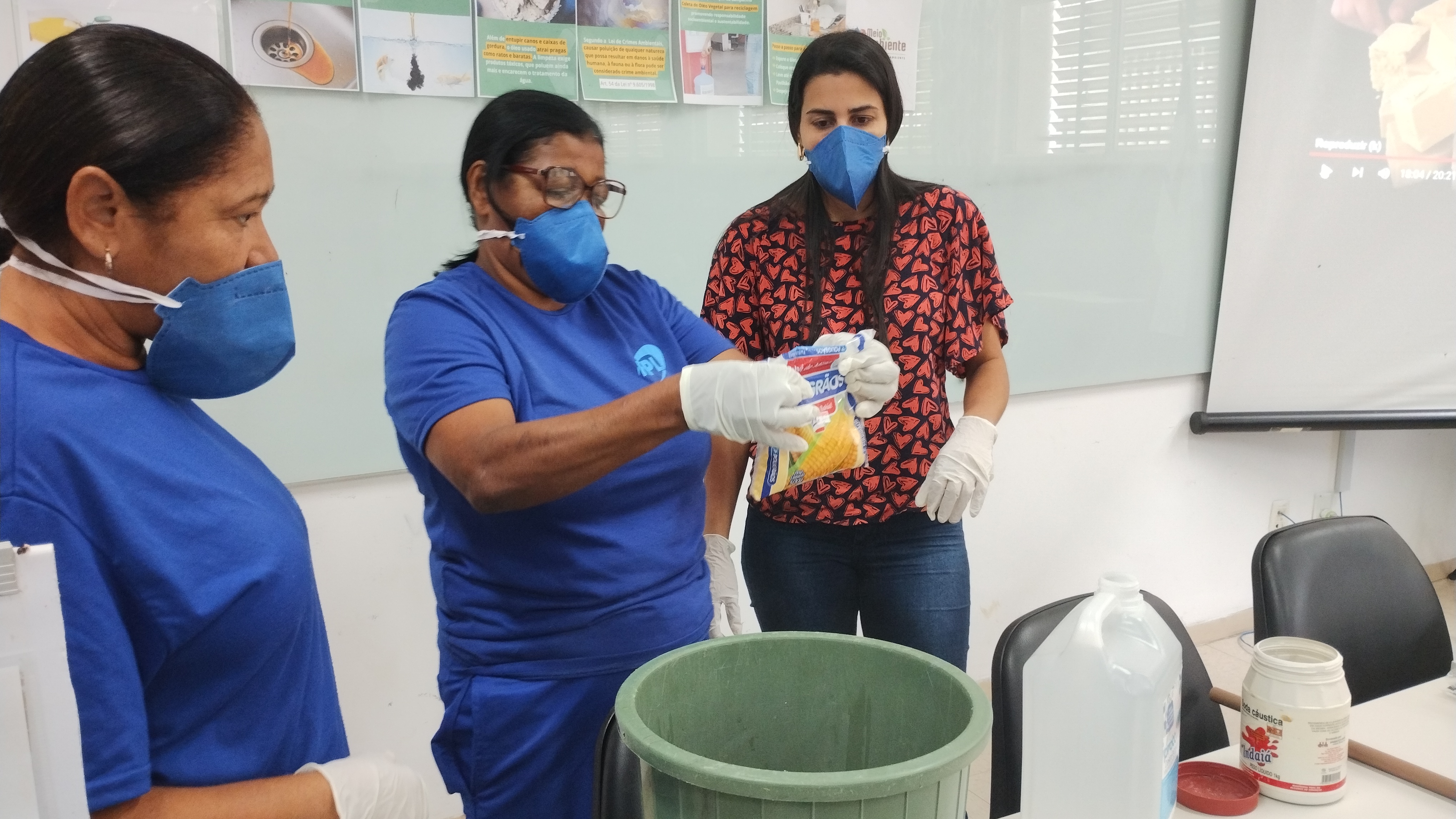 Após a explicação teórica e a exibição de um vídeo demonstrativo, três voluntárias participaram da parte prática, realizando a mistura e o preparo conforme as orientações recebidas. Ao final, a mistura foi deixada para repousar, e devido ao tempo de secagem, o resultado final será divulgado posteriormente nas redes sociais do CFP. O sabão produzido será distribuído entre os participantes da oficina, e o excedente ficará disponível para a comunidade acadêmica na portaria do Pavilhão Administrativo.