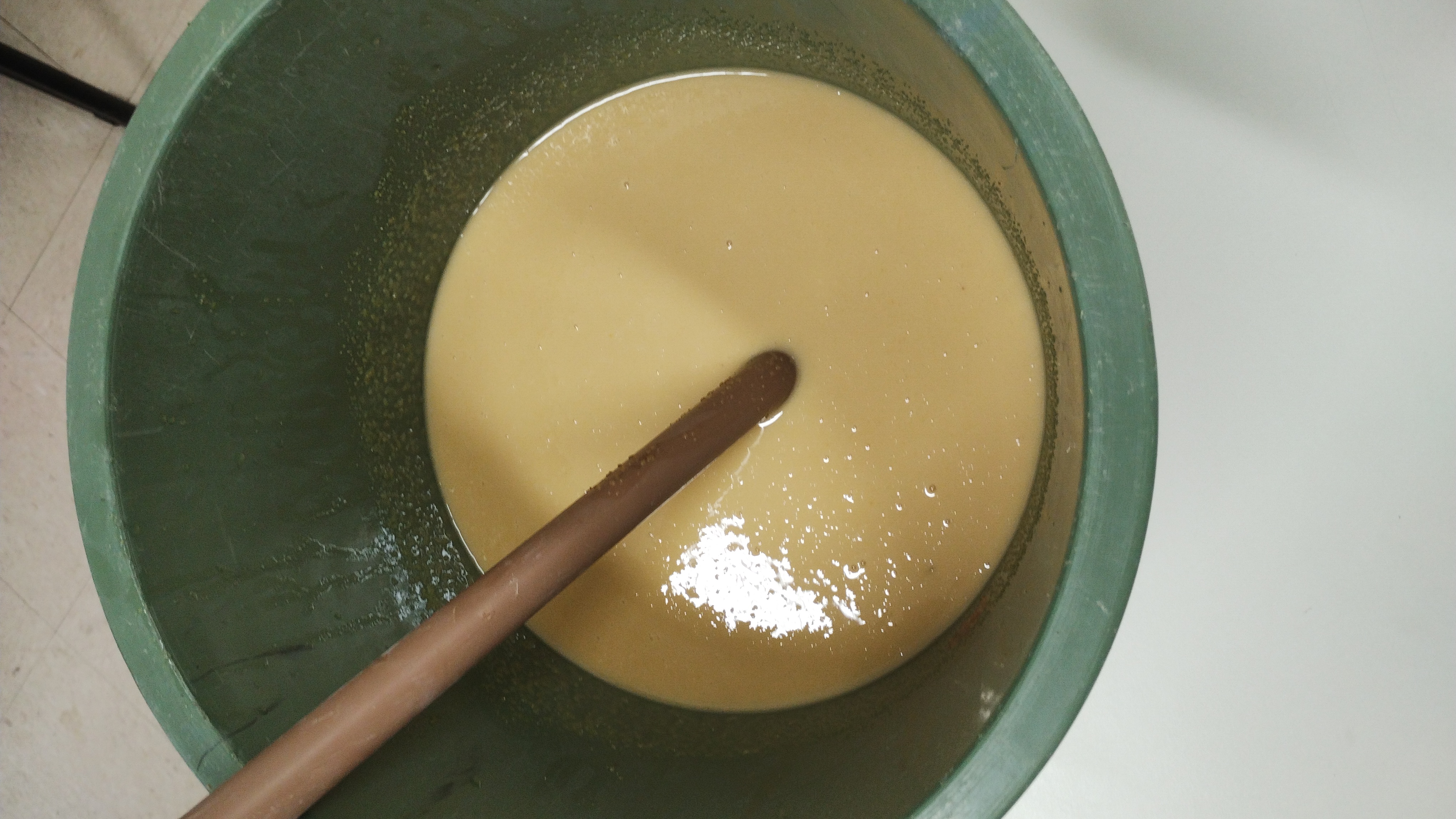 O instrutor apresentou os ingredientes básicos para a produção do sabão caseiro (água, óleo e soda cáustica), reforçando que existem diversas formas de prepará-lo, cabendo a cada pessoa escolher a mais adequada. Ele também alertou sobre os cuidados necessários no manuseio da soda cáustica (96-99%), como o uso obrigatório de máscara e luvas protetoras, e detalhou o processo de mistura.