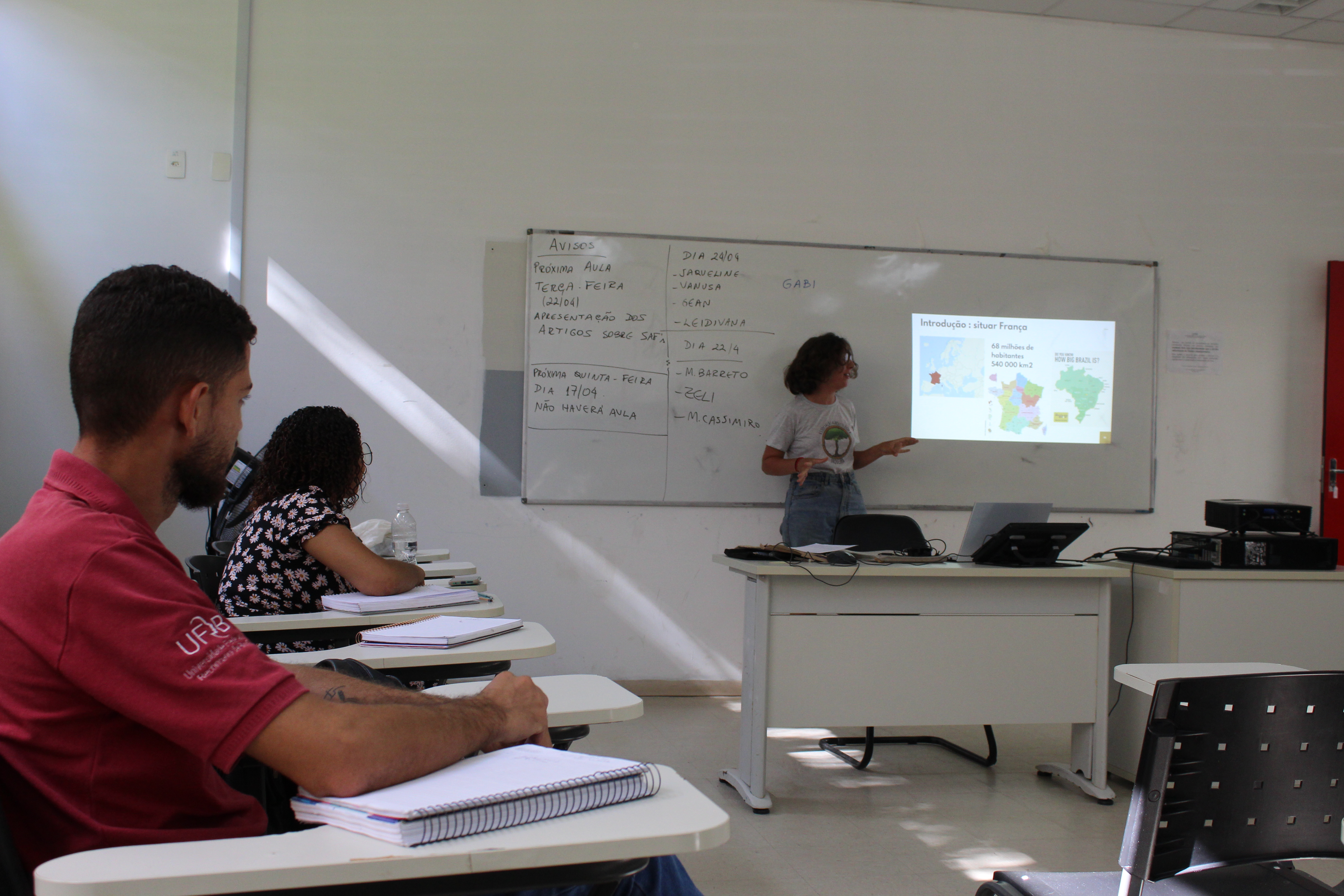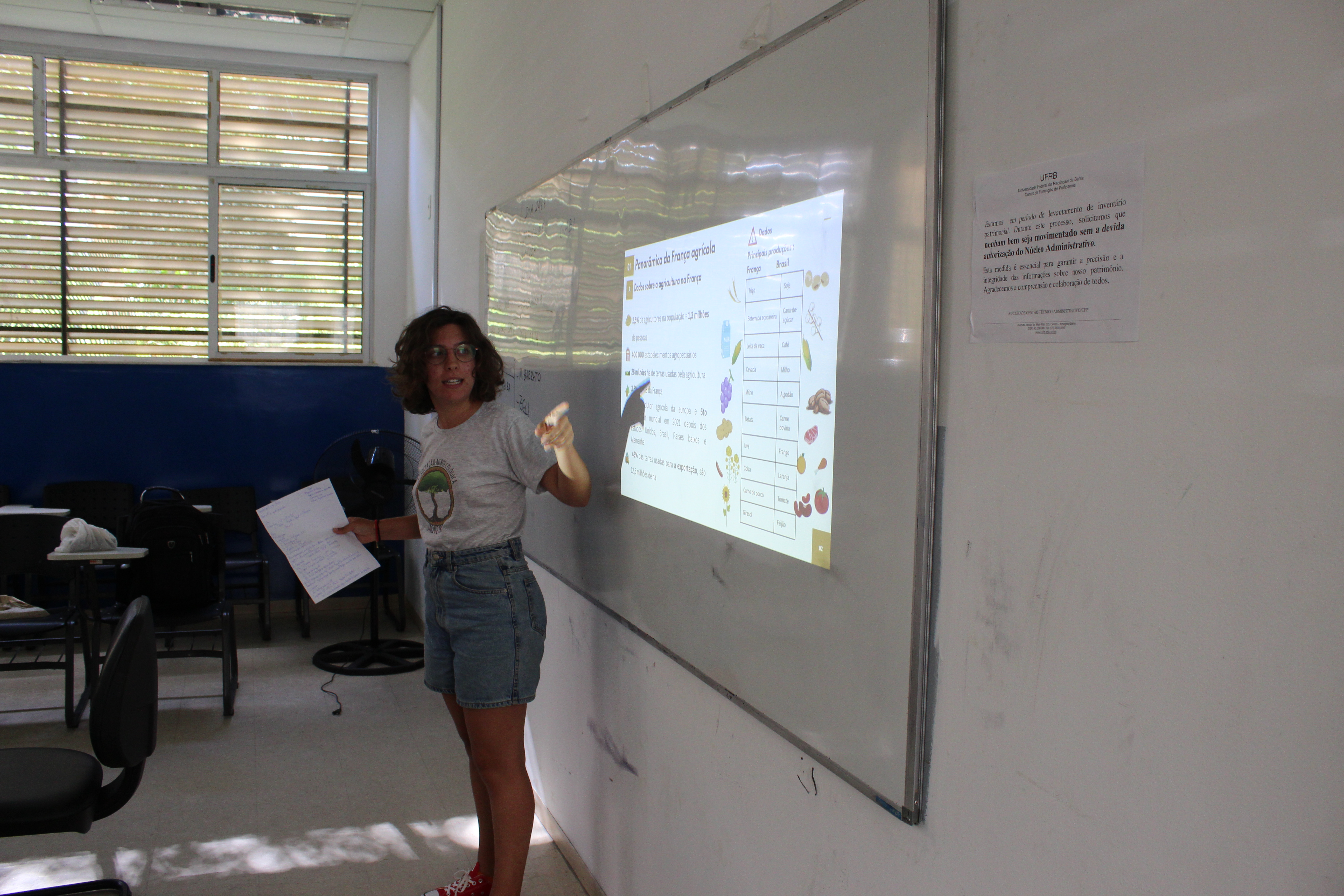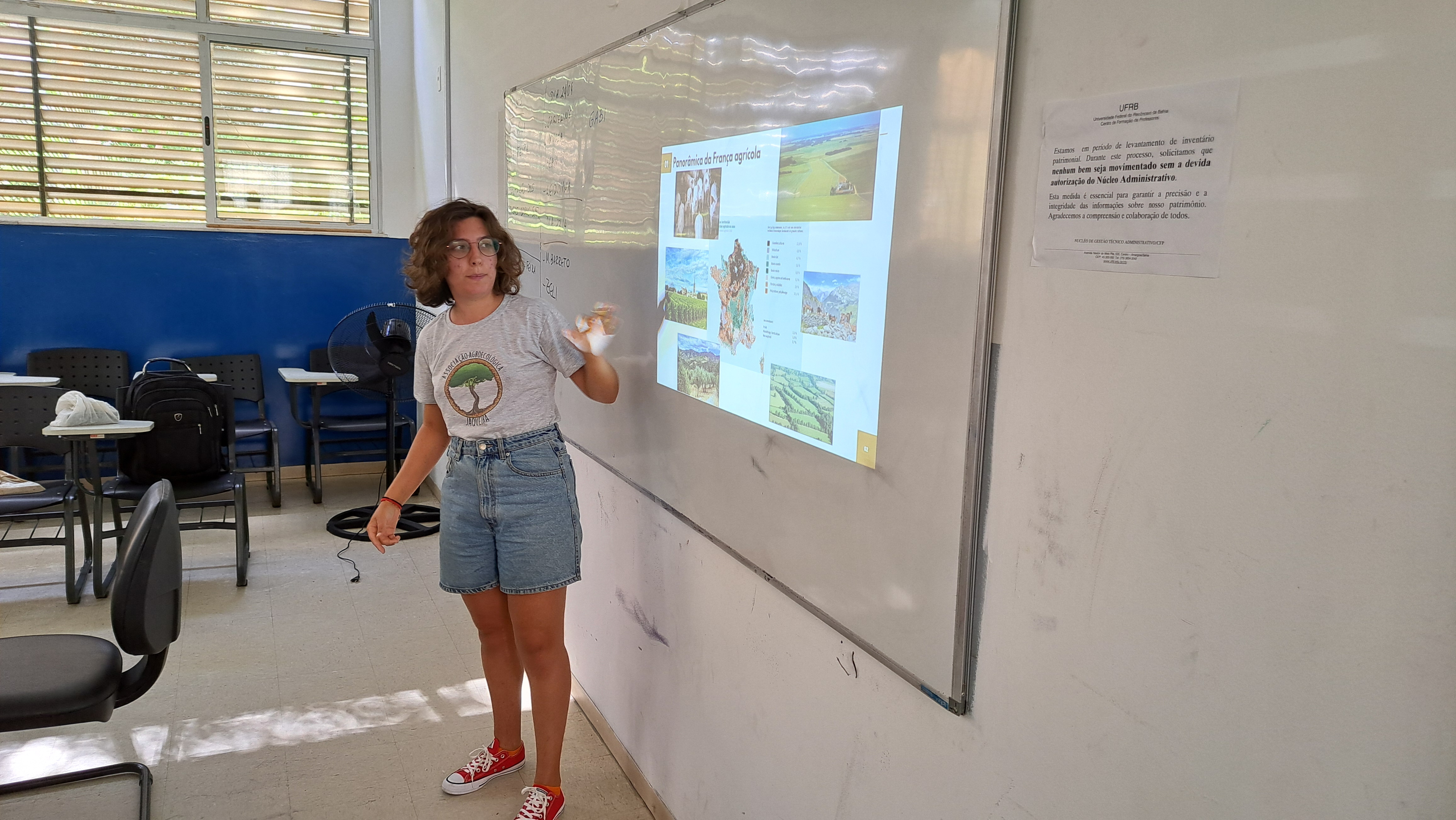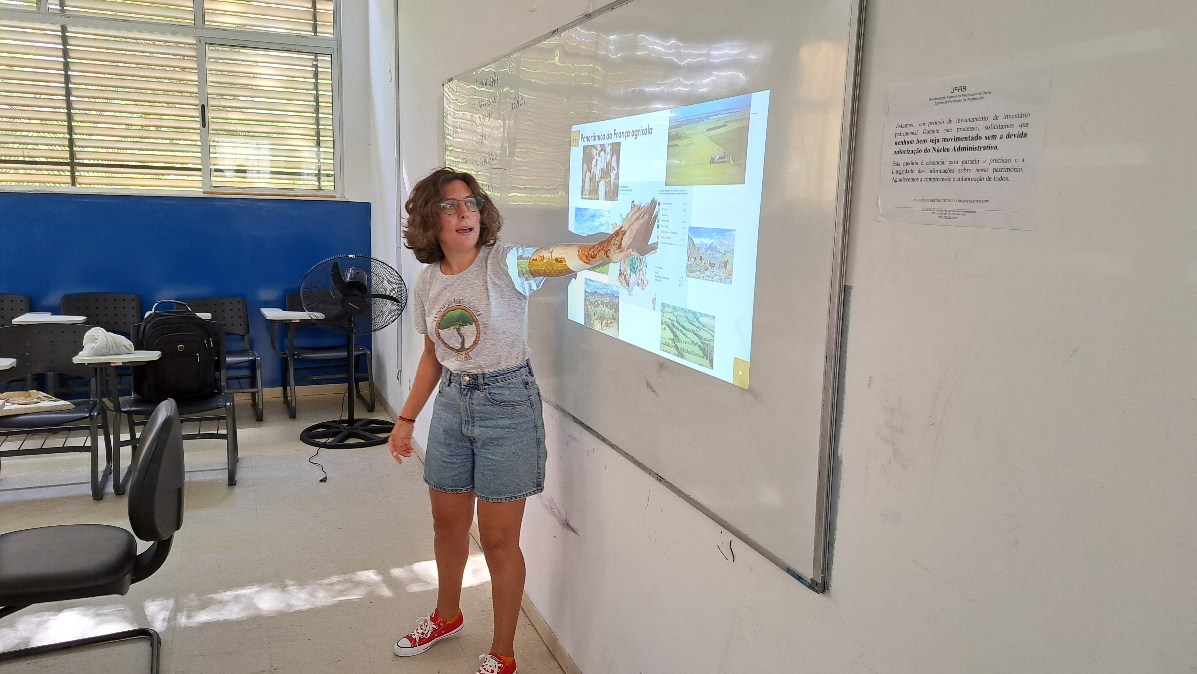 Na manhã do dia 15 de abril, a estudante francesa Garance Desplat, mestranda na renomada Universidade de Sorbonne, realizou uma palestra enriquecedora para os alunos do curso de Licenciatura em Educação do Campo do Centro de Formação de Professores (CFP). Durante sua apresentação, Garance compartilhou um panorama detalhado sobre a atual realidade da agricultura em seu país de origem, oferecendo aos participantes uma perspectiva internacional sobre os desafios do setor.