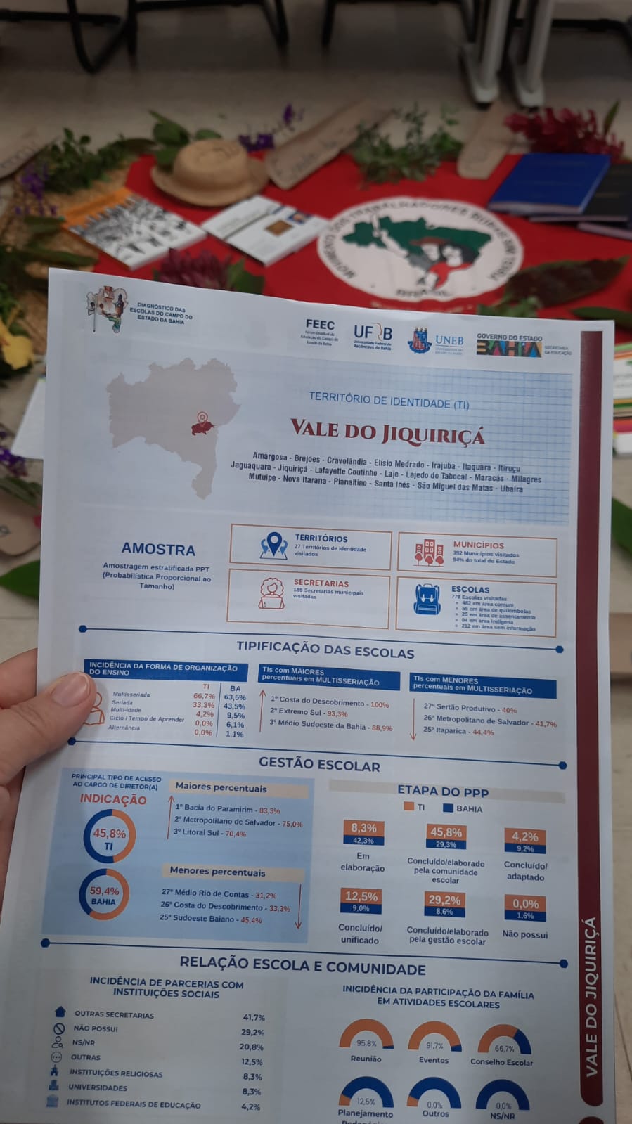 Na oportunidade foram divulgados os resultados finais da pesquisa, que foi financiada pela Secretaria de Educação do Estado da Bahia, SEC-Ba, através da Diretoria de Educação de Povos e Comunidades Tradicionais, e foi coordenada pela UNEB em articulação com o Fórum de Educação do Campo da Bahia e a UFRB. A pesquisa, percorreu 392 municípios, 187 secretarias municipais de educação 778 escolas do campo, das águas e das florestas da Bahia.