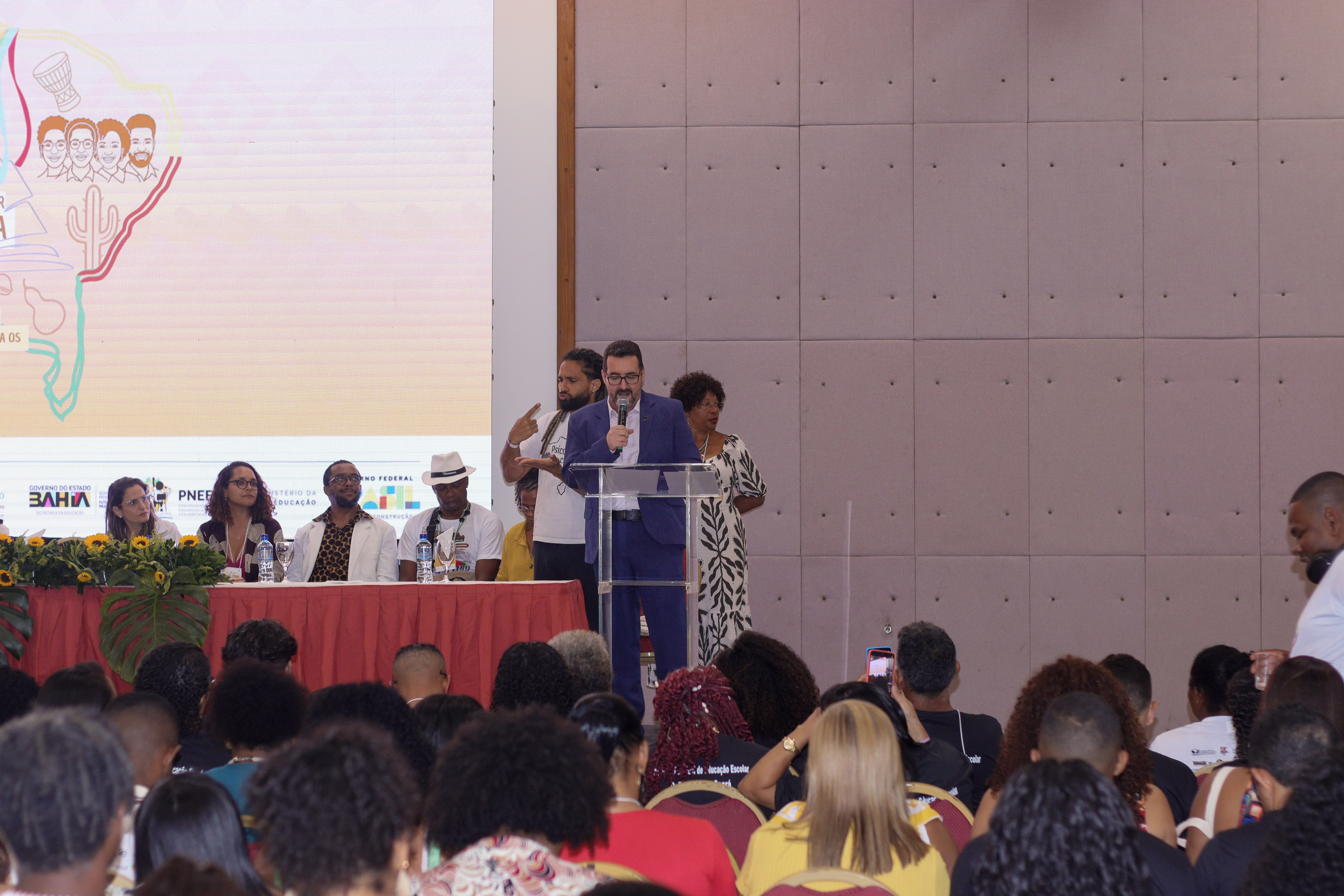 Florisvaldo Rodrigues (CEAQ-Ba) e Maria Rosalina, do Piauí. A Secretaria de Educação do Estado da Bahia - uma das promotoras do evento - foi representada por Cássia Margarete Amaro e Uilson Viana, ambos da Diretoria de Educação para Povos e Comunidades Tradicionais da SEC-Ba. A SECADI foi representada por Eduardo Fernandes de Araújo, Coordenador-Geral de Educação Escolar Quilombola. A UFRB esteve representada na mesa de abertura pela Profa. Terciana Moura, Coordenadora do PPGEDUCAMPO; Prof. Fábio Josué Souza dos Santos, vice-Reitor da UFRB e Tiago Rodrigues Santos, um dos coordenadores gerais do evento. Além da UFRB, participaram da Mesa de Abertura representantes das reitorias da UNEB, UESB,UNILAB e IFBA.