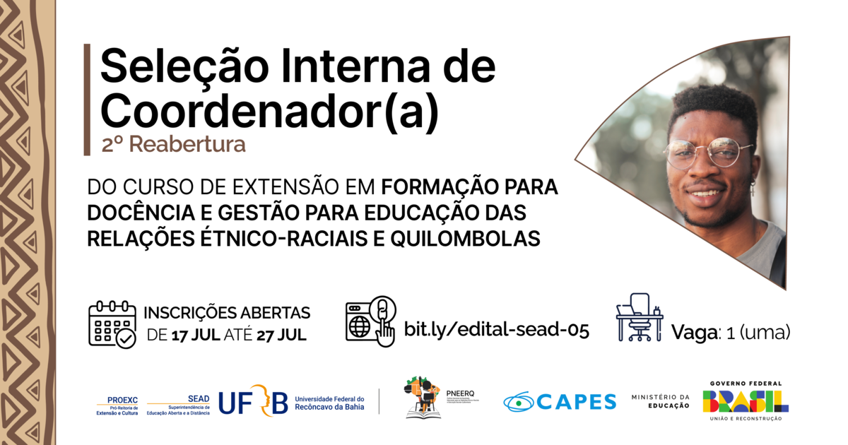 UFRB lança 2ª Reabertura do Edital SEAD Nº 05/2025 para Seleção de Coordenador(a) de Curso de Extensão em Educação Étnico-Racial e Quilombola na Modalidade EaD