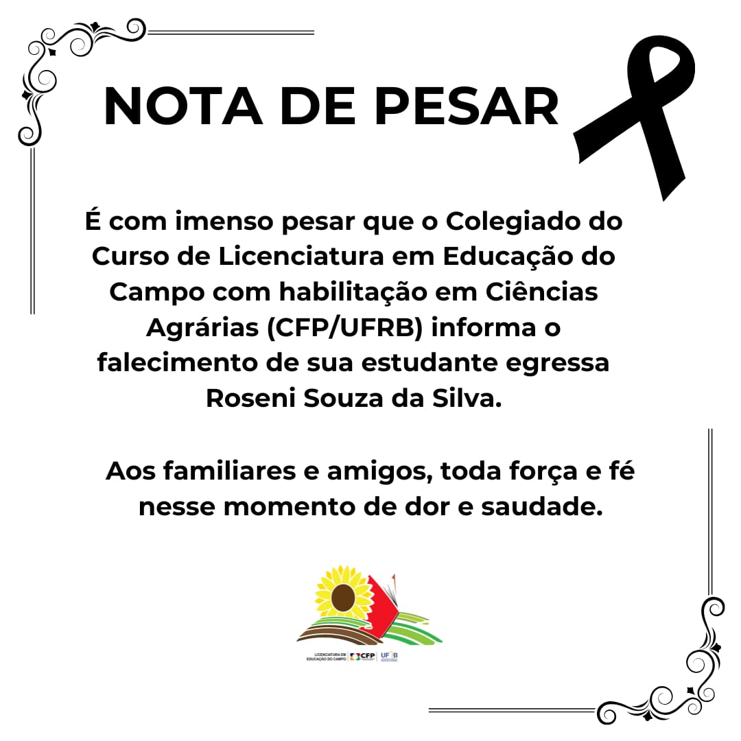 É com profundo pesar que o Colegiado do Curso de Licenciatura em Educação do Campo com habilitação em Ciências Agrárias (CFP/UFRB) comunica o falecimento de sua ex-estudante Roseni...