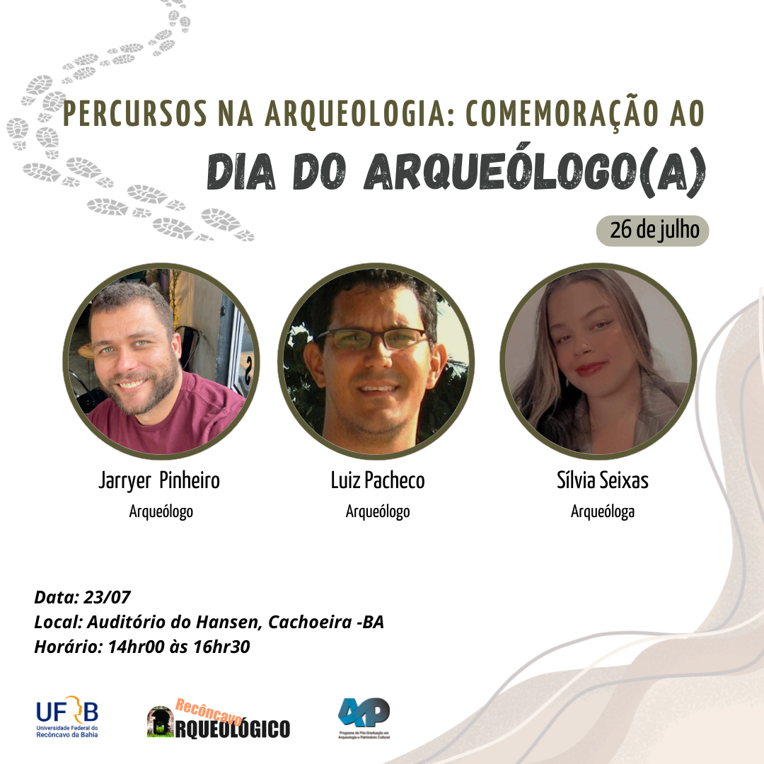 O Grupo de Pesquisa Recôncavo Arqueológico, vinculado ao curso de Museologia da Universidade Federal do Recôncavo da Bahia (UFRB), Campus Cachoeira, divulga a realização do evento "Percursos na Arqueologia: Comemoração ao Dia do Arqueólogo (a), no dia 23 de julho, a partir das 14h, no Auditório Hansen, em Cachoeira.