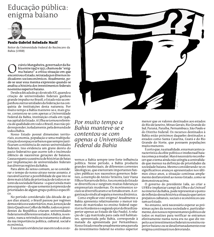 Artigo publicado no Jornal Atarde, no domingo, 20 de setembro, de autoria do Reitor da UFRB, Paulo Gabriel Nacif.