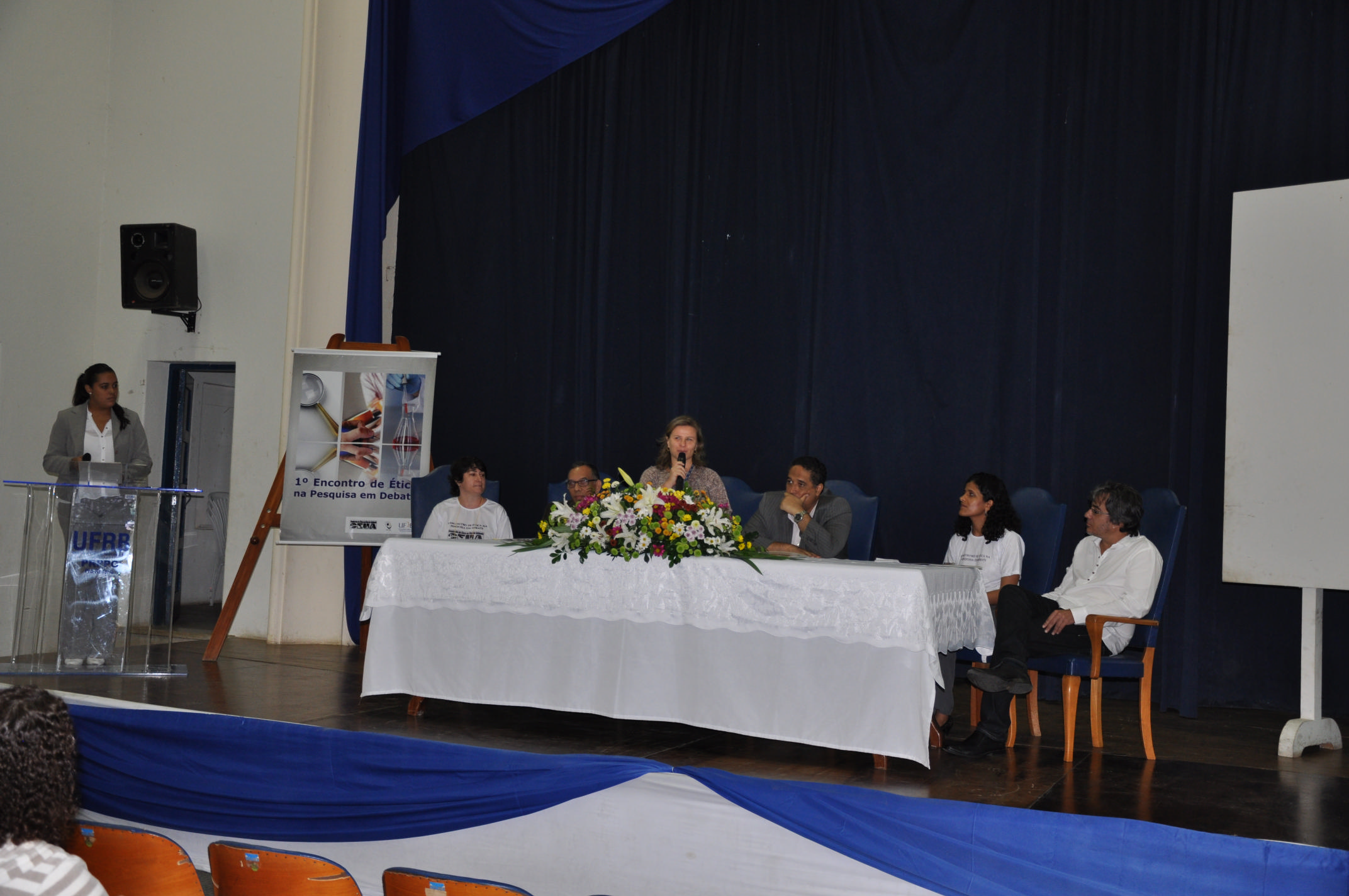 "Espero que possamos avançar sobre esse debate na UFRB, pois a ética é um princípio fundamental dentro das Universidades", destacou o reitor Paulo Gabriel Nacif na mesa de abertura do evento. Ao seu lado, o palestrante Claudio Lorenzo; a coordenadora do CEUA, professora Cecília Poy; a coordenadora do CEP, Deisy Santos; representantes das Pró-Reitora de Extensão, Cláudio Manoel Souza, e da Pró-Reitora de Pesquisa e Pós-Graduação, Franceli Silva.
