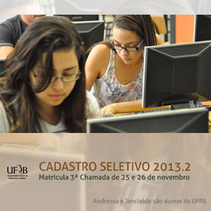 A relação dos aprovados na 3ª chamada do Cadastro Seletivo 2013.2 da Universidade Federal do Recôncavo da Bahia (UFRB) já está disponível. Os candidatos que se inscreveram para continuar concorrendo às vagas remanescentes do SiSU em cursos de graduação da UFRB têm os dias 25 e 26 de novembro para efetivarem a matrícula.