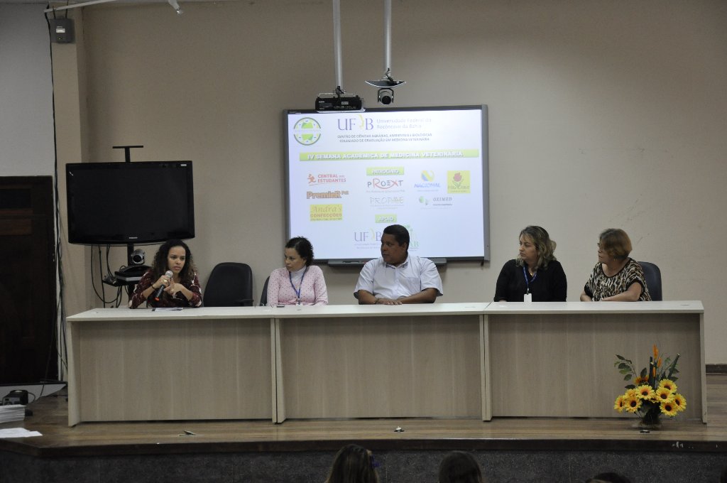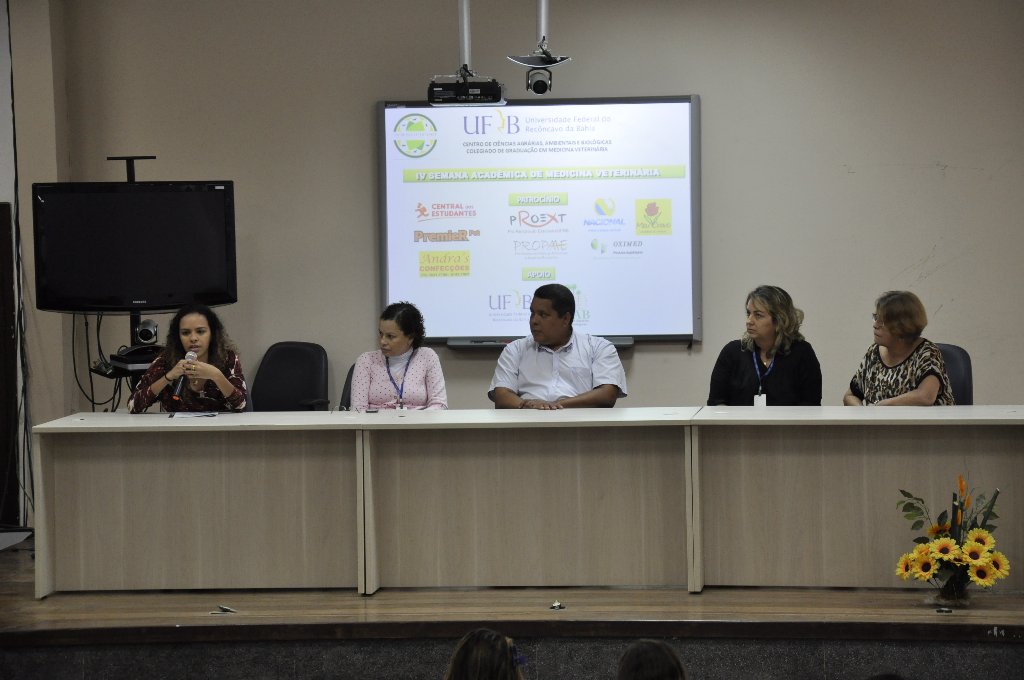 Na mesa de abertura estiveram presentes a secretária-geral do Conselho Regional de Medicina Veterinária do Estado da Bahia (CRMV-Ba), Marilene Caldas; o vice-diretor do Centro de Ciências Agrárias, Ambientais e Biológicas (CCAAB), Josival Souza; a diretora do Hospital Universitário de Medicina Veterinária (HUMV), Ana Paula Peixoto; a vice-coordenadora do curso de Medicina Veterinária da UFRB, Ludmilla Santana, e a coordenadora do evento, Evellin Matos, representando os discentes. Durante a abertura, o vice-diretor Josival Souza parabenizou os estudantes que sempre batalharam para a realização e conseguiram a regularidade do evento; também ressaltou a seriedade e o compromisso que todos demonstram pela busca do conhecimento.