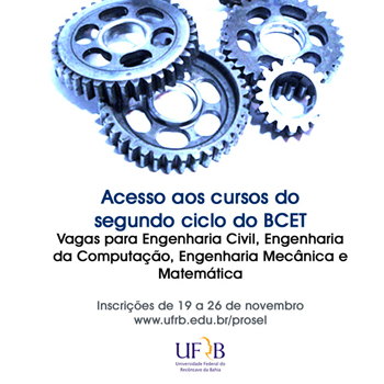 A Universidade Federal do Recôncavo da Bahia (UFRB), por meio da Pró-Reitoria da Graduação, informa que está aberto o processo seletivo para preenchimento de vagas para os cursos do Segundo Ciclo de Estudos do Bacharelado em Ciências Exatas e Tecnológicas (BCET), com ingresso no para o segundo semestre letivo de 2014.