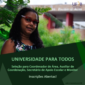 Projeto Universidade para Todos - o Projeto Universidade para Todos tem por objeto a preparação de alunos, que estão cursando o 3º ano do Ensino Médio da Rede Pública do Estado da Bahia e egressos, para o processo seletivo de acesso ao Ensino Superior, por meio de aulas ministradas por estudantes de universidades públicas baianas que atuarão na condição de monitores sob a coordenação de professores da Universidade federal do Recôncavo da Bahia.