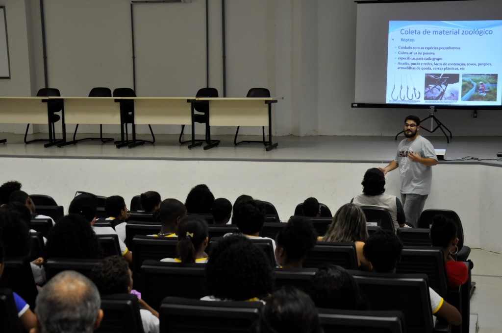 Na quarta-feira, dia 17, a exposição recebeu a visita de alunos do 7º ano do Colégio Municipal Jorge Guerra. A vice-diretora Crislane Vieira e a professora Osdi Ribeiro acompanharam as turmas. “É sempre importante essa parceria firmada entre a instituição de ensino superior com a educação básica, principalmente na nossa cidade, uma vez que os alunos não têm muitas oportunidades de contato com exposições, museus, zoológicos”, diz a professora. “Quando a universidade proporciona esses momentos de irmos a campo, a construção do conhecimento se efetiva de forma mais interessante para os alunos”, afirma.