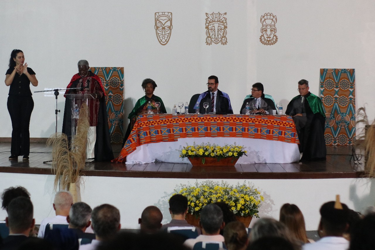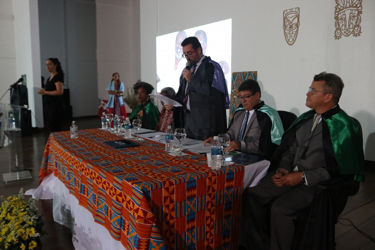 A mesa de honra foi composta pelas presenças do reitor e vice-reitor da UFRB, respectivamente, Fábio Josué dos Santos e José Pereira Mascarenhas Bisneto; os diretores Dyane Brito Reis Santos, do Centro de Artes, Humanidades e Letras e Danillo Silva Barata, do Centro de Cultura, Linguagens e Tecnologias Aplicadas; e o homenageado, professor Kabengele Munanga. Pela ordem, fizeram uso da palavra, Dyane Brito Reis Santos, Danillo Silva Barata, Kabengele Munanga, José Mascarenhas Bisneto e Fábio Josué.