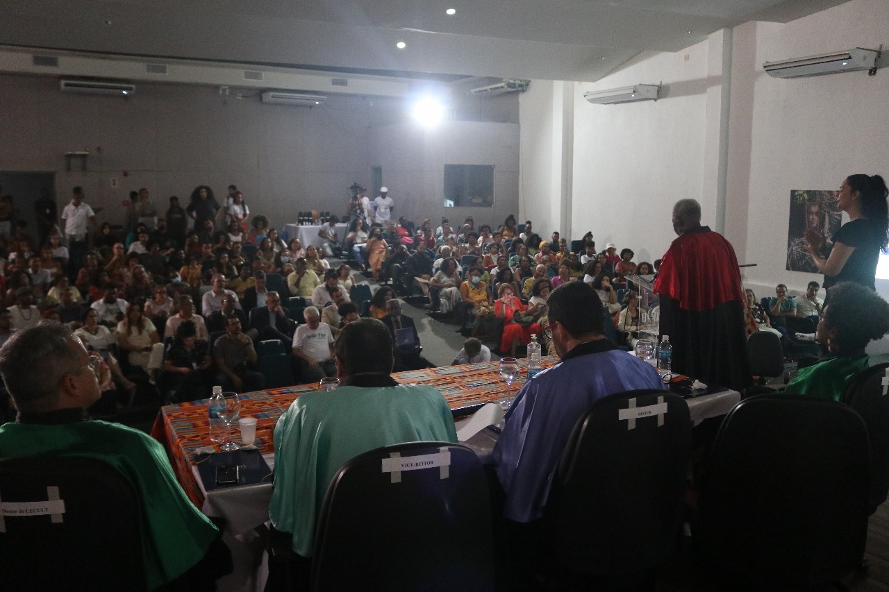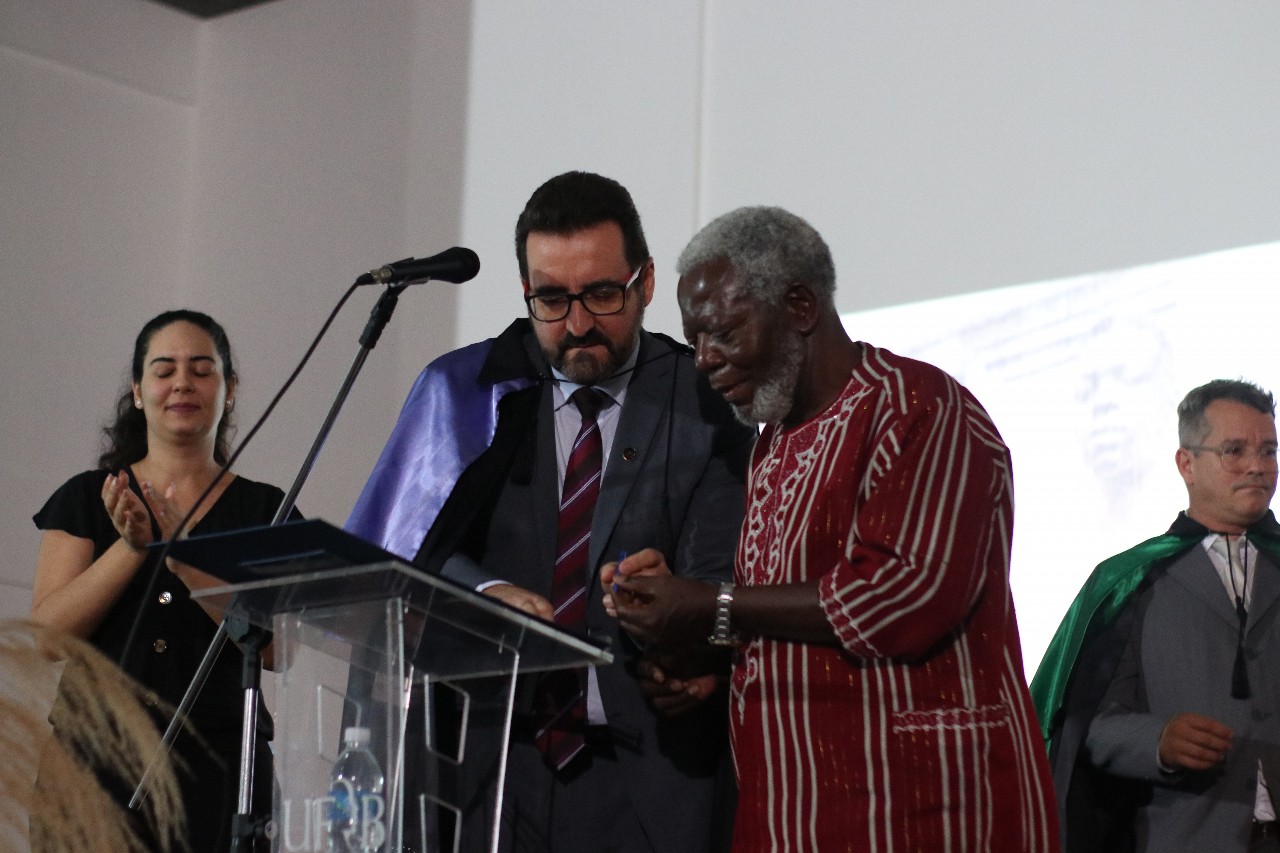 O educador negro, ativista da luta antirracista, intelectual e pesquisador de estudos negros e afro-brasileiros, Kabengele Munanga, 79 anos, recebeu o título de Doutor Honoris Causa da Universidade Federal do Recôncavo da Bahia (UFRB), em sessão solene do Conselho Universitário (CONSUNI), realizada na tarde de ontem, dia 8, no auditório do Centro de Artes, Humanidades e Letras (CAHL).